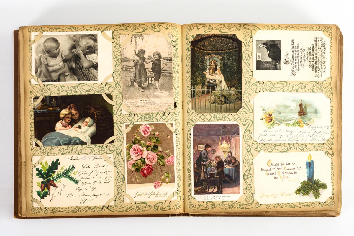 Gruß-, Kitsch und Glückwunschkarten. Hauptsächlich Deutsch, auch in Holländisch und Französisch. Braunes "Album pour Cartes Postales" mit Dame und Segelschiffen.