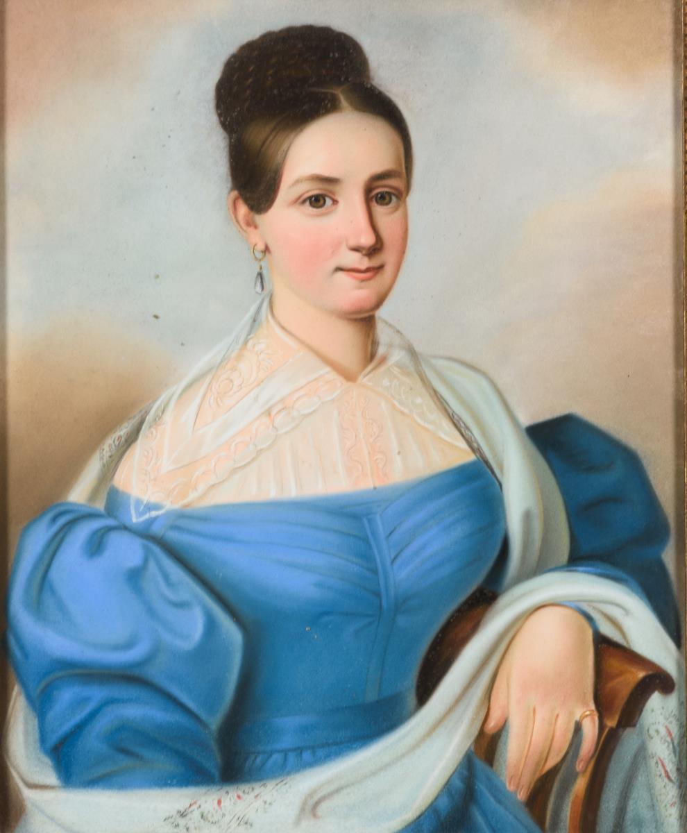 Porträtpendants mit junger Frau hellem blauen Kleid und einem jungen Mann in blauem Rock mit schwarzem Mantel. Je leichte Altersspuren.
