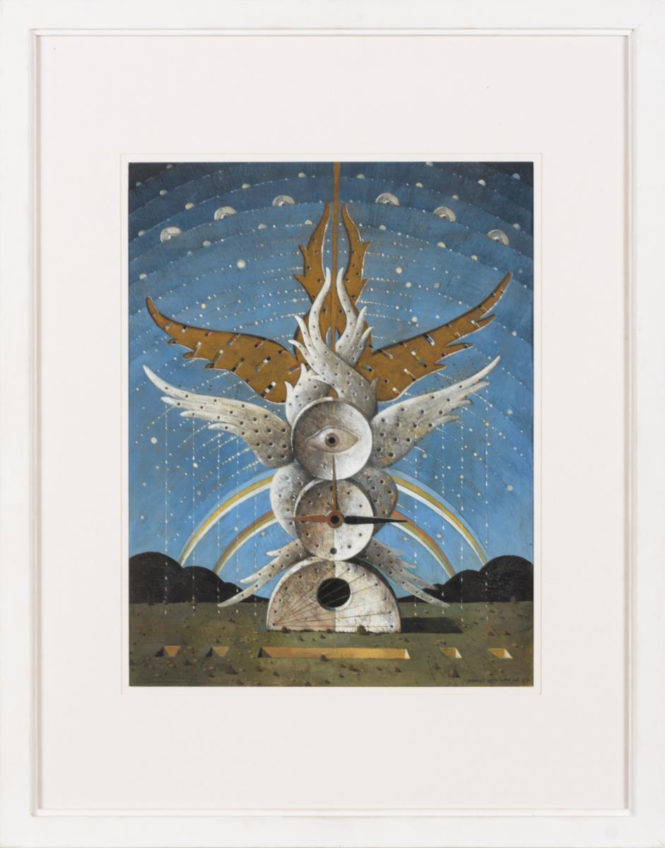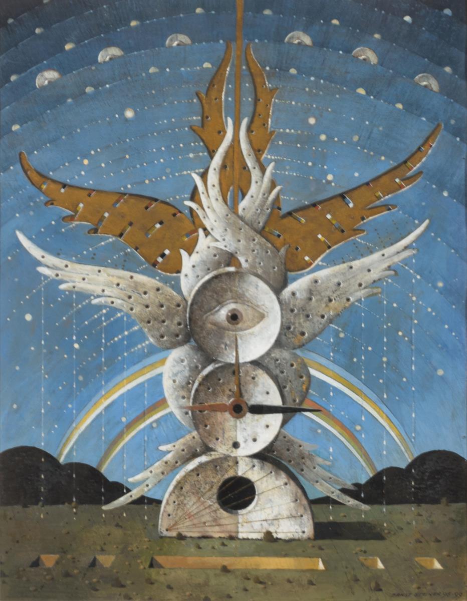 Großes Objekt mit Flügeln und Auge in einer weiten Landschaft und in Sphären aufgeteiltem Himmel.