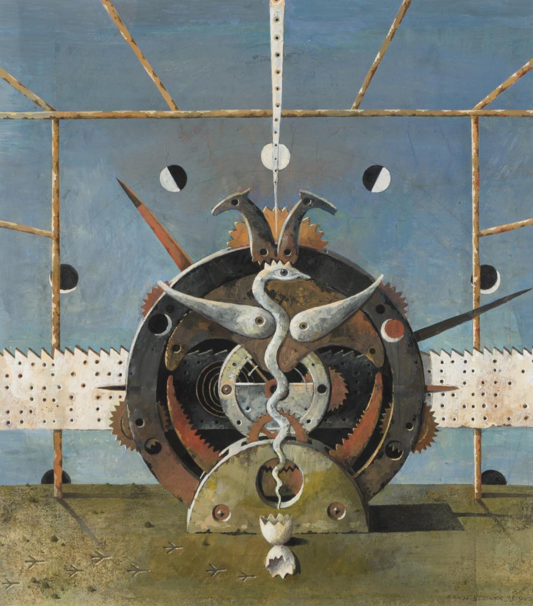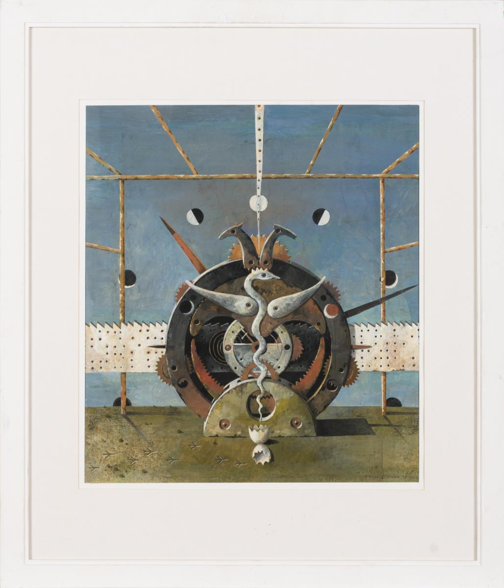 Maschinerie mit Federn, Zahnrädern und zerbrochenem Ei, von dem sich Fußspuren entfernen.