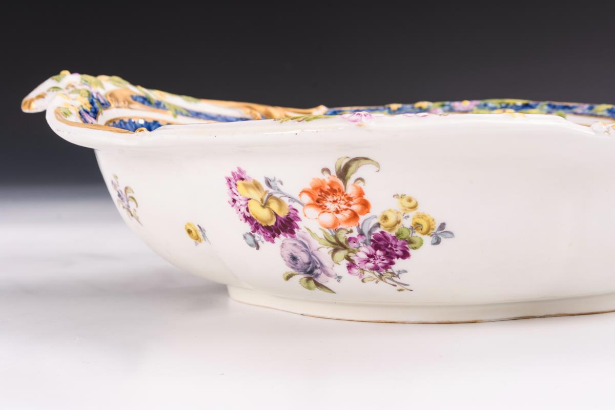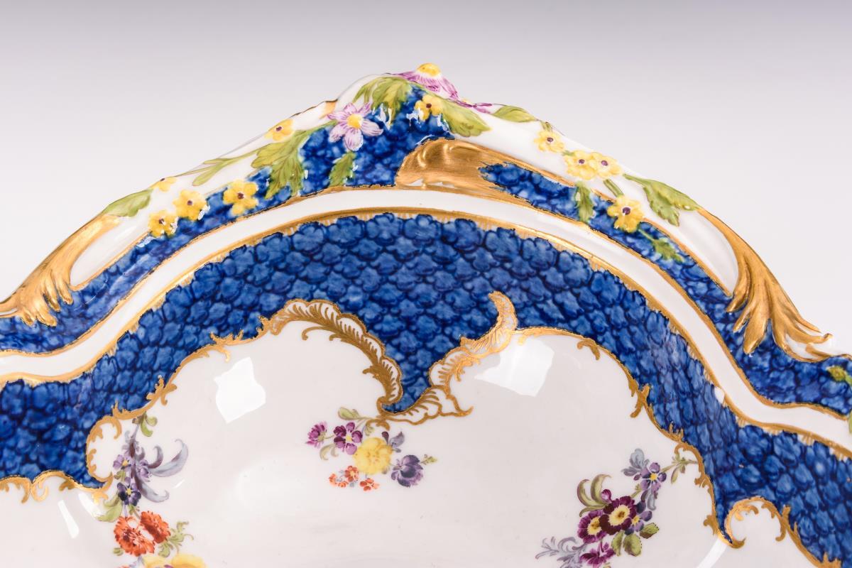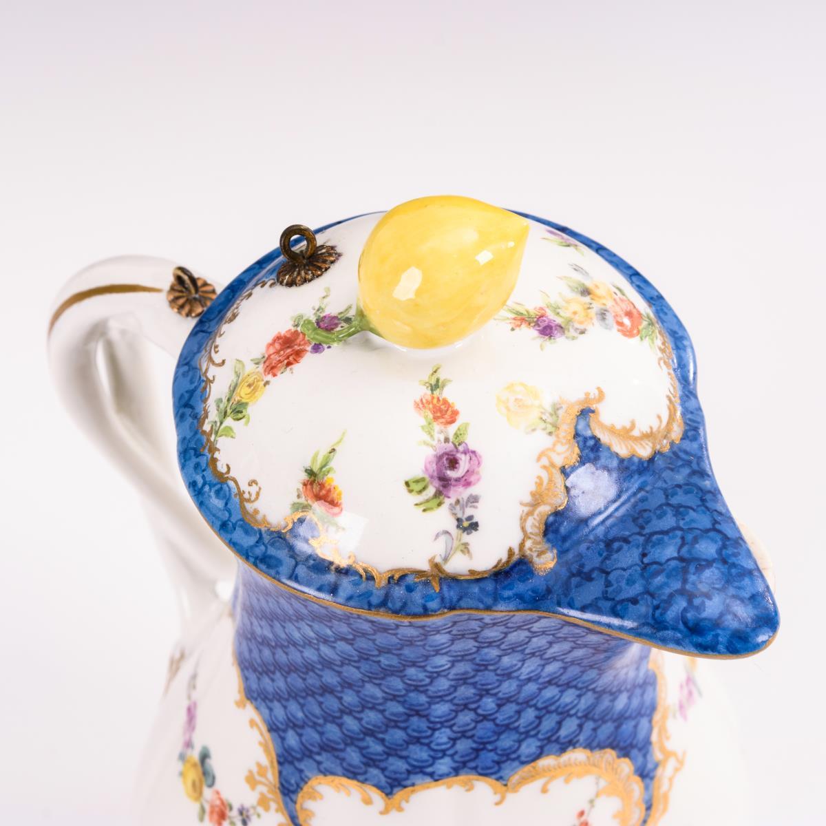 Mit blauem Schuppen-Teilfond, Blumenfestons. Schale mit Blütenrelief. Kannenstand, -deckel und - henkel restauriert, Kettchen an der Kanne fehlt.
