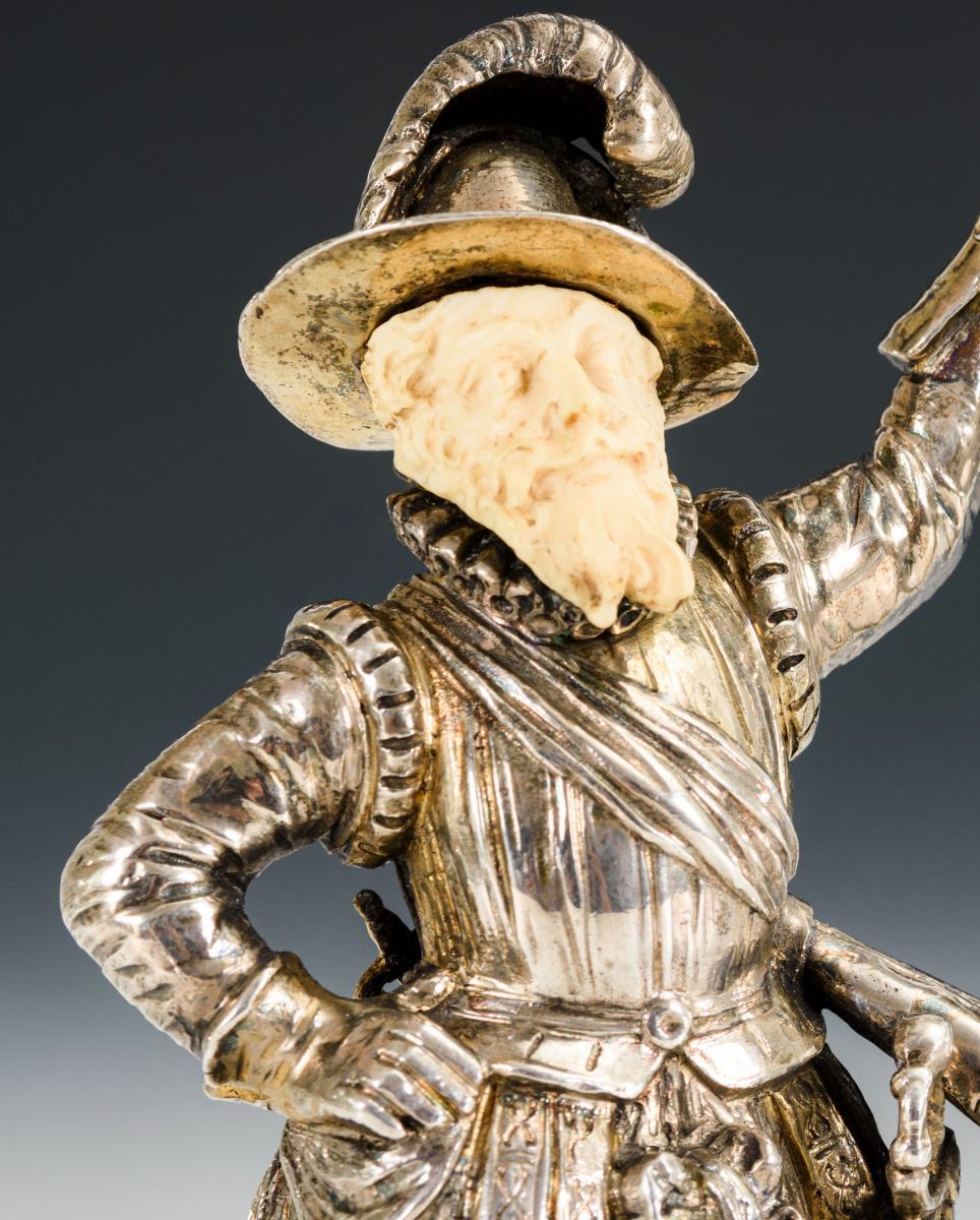 Stehende Figur in historischer Tracht, mit geschnitztem Kopf aus Elfenbein. 2 Füße etwas gestaucht.