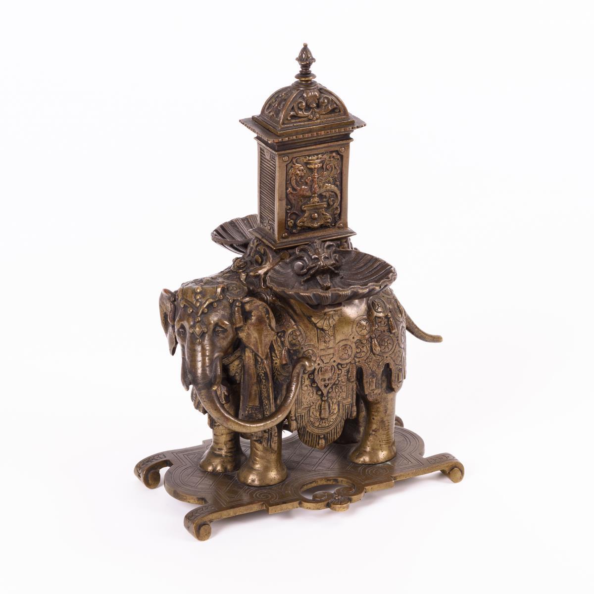 Auf teppichartiger Bronze-Plinthe stehender, prächtig geschmückter Elefant mit turmartigem Streichholzhalter und seitlichen Muschelschalen. Lötstelle am Rüsselansatz.