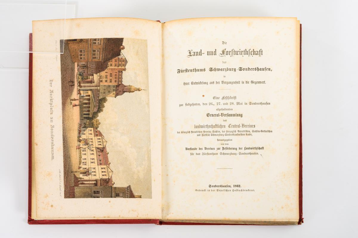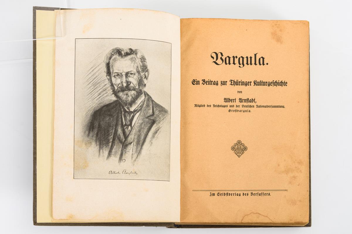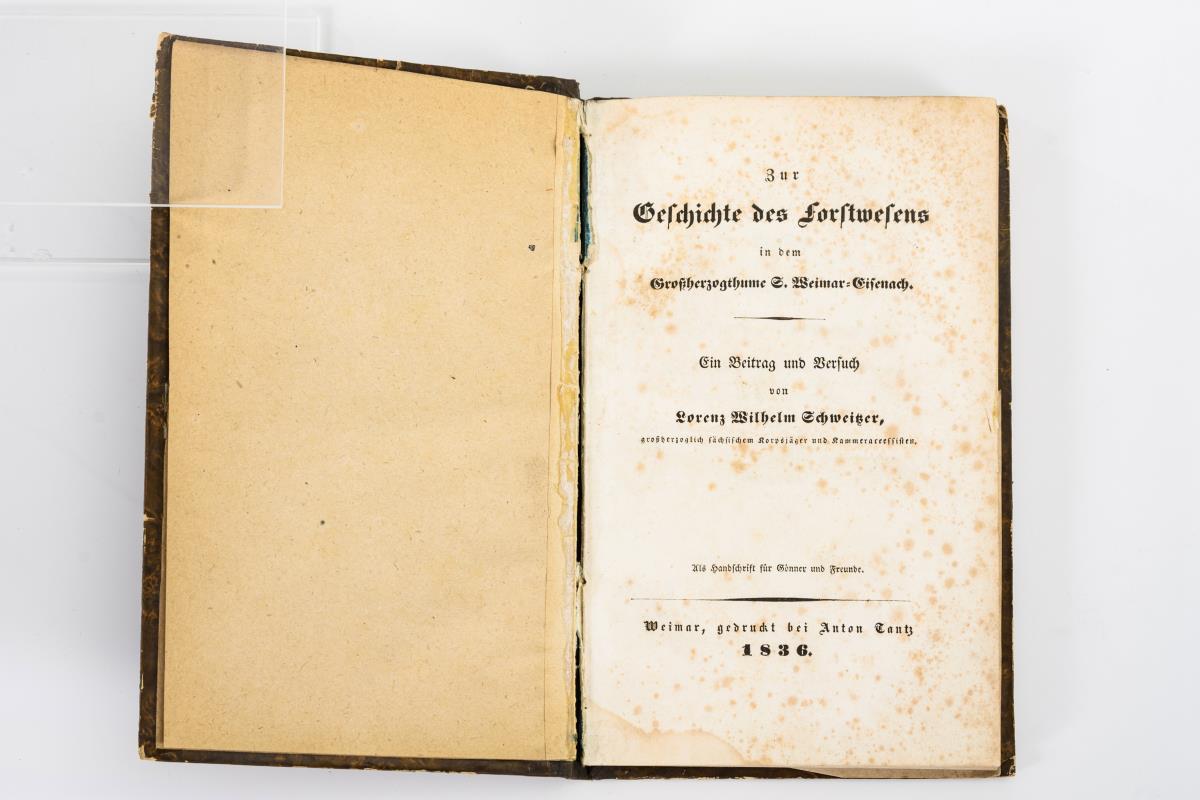 Schweitzer, Lorenz Wilhelm: "Zur Geschichte des Forstwesens in dem Großherzogthume S. Weimar-Eisenach". Weimar 1836, gedruckt bei Anton Tantz, 168 Seiten. / "Die Land- und Forstwirthschaft des Fürstenthums Schwarzburg-Sondershausen in ihrer Entwicklung aus der Vergangenheit und Gegenwart", Festschrift, Sondershausen 1862, 304 Seiten und eine Karte. / Arnstadt, Albert: "Vargula - Ein Beitrag zur Thüringer Kultugeschichte" Selbstverlag 1917, 615 Seiten. / Lehfeldt; P.: "Bau- und Kunstdenkmäler Thüringens - Amtsgerichtsbezirke Grossrudestedt und Vieselbach, Grossherzogthum Sachsen-Weimar-Eisenach", Heft XVI, Jena 1892, Broschur, 94 Seiten. Alle mit altersgemäßen Gebrauchsspuren.