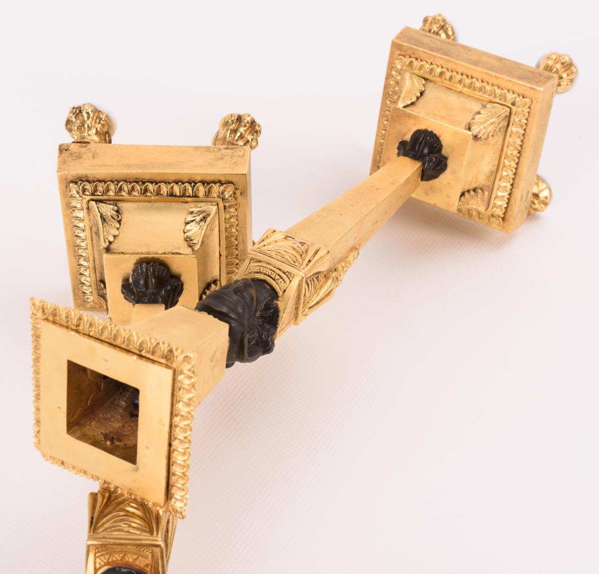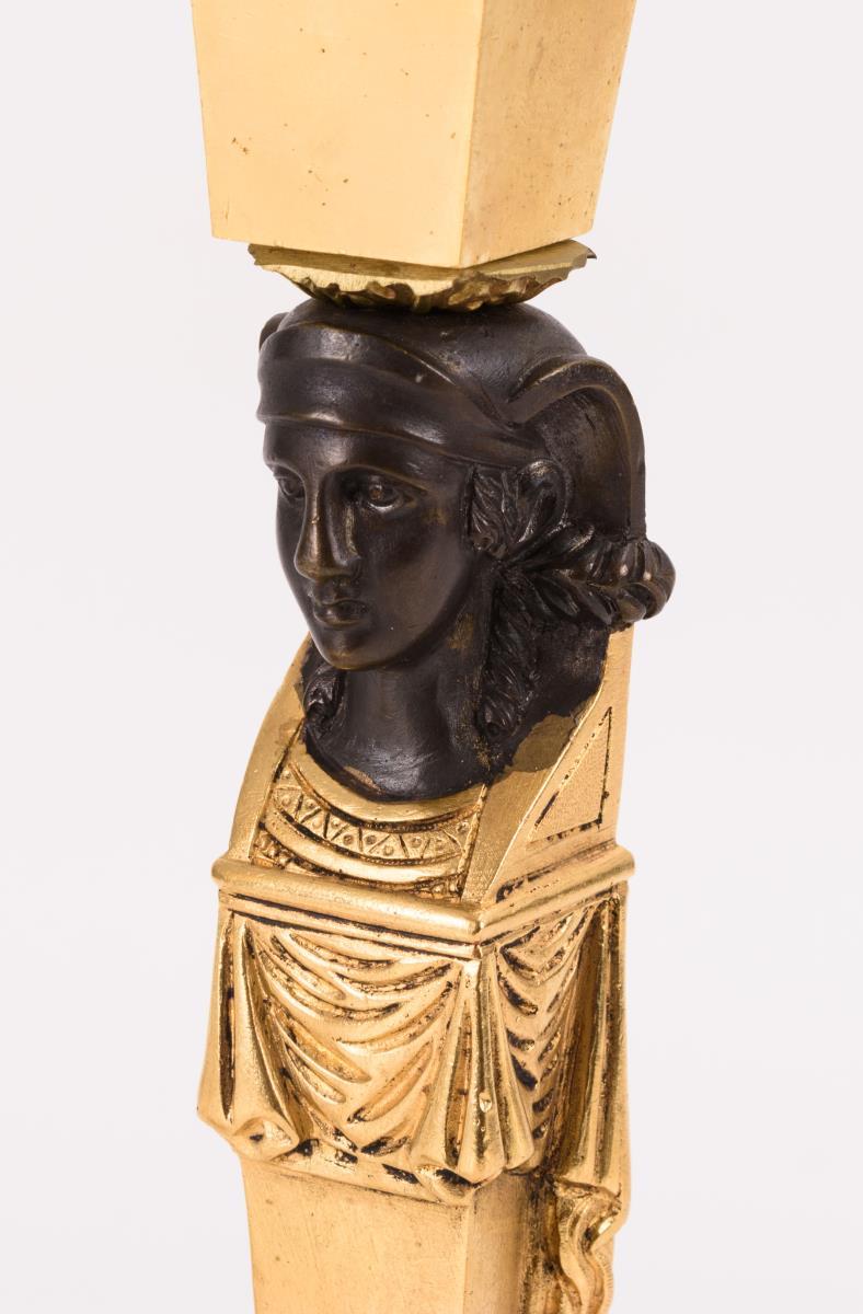 Im Kontrast von Gold und Schwarz gearbeitete Bronzeleuchter. Quadratsockel mit Tatzenfüßen und Blattbesatz. Vollplastischer Hermenpfeiler mit ägyptisierender Büste sowie konische Vierkant-Tülle mit Blattkranz. Füße ergänzt, davon 1 mit kleinem Gussfehler, sonst kaum Alters-/Gebrauchsspuren.