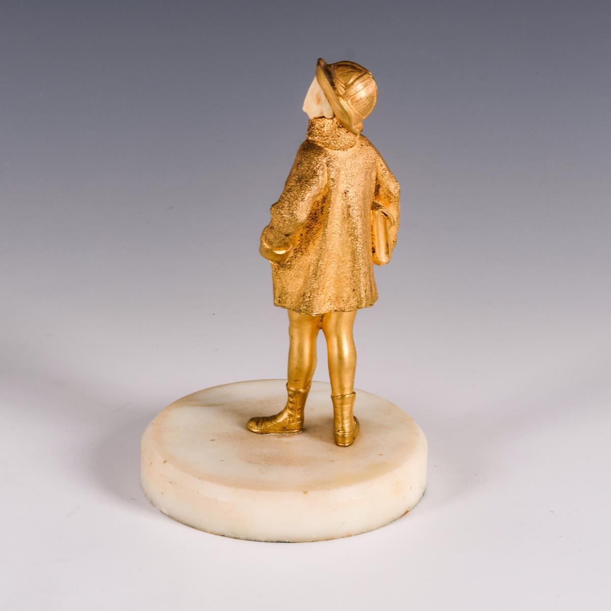Bronze mit goldfarbenem Überzug, Elfenbein, weiße Marmor-Plinthe. 1920/30er Jahre. H 15,5 / 17,5 cm.