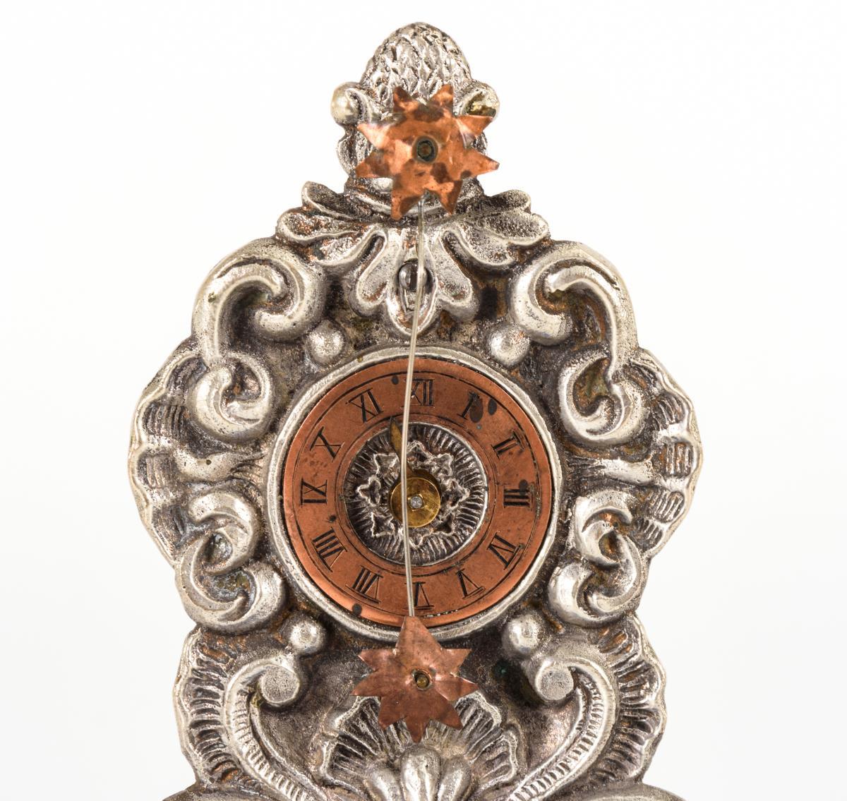 Historistische Uhr in taillierter Form mit Rocaille-Reliefs. Auf ebonisiertem Ovalsockel mit Glasdom. Läuft nicht. Befestigung der Uhr auf Sockel teils fehlend, Altersspuren.