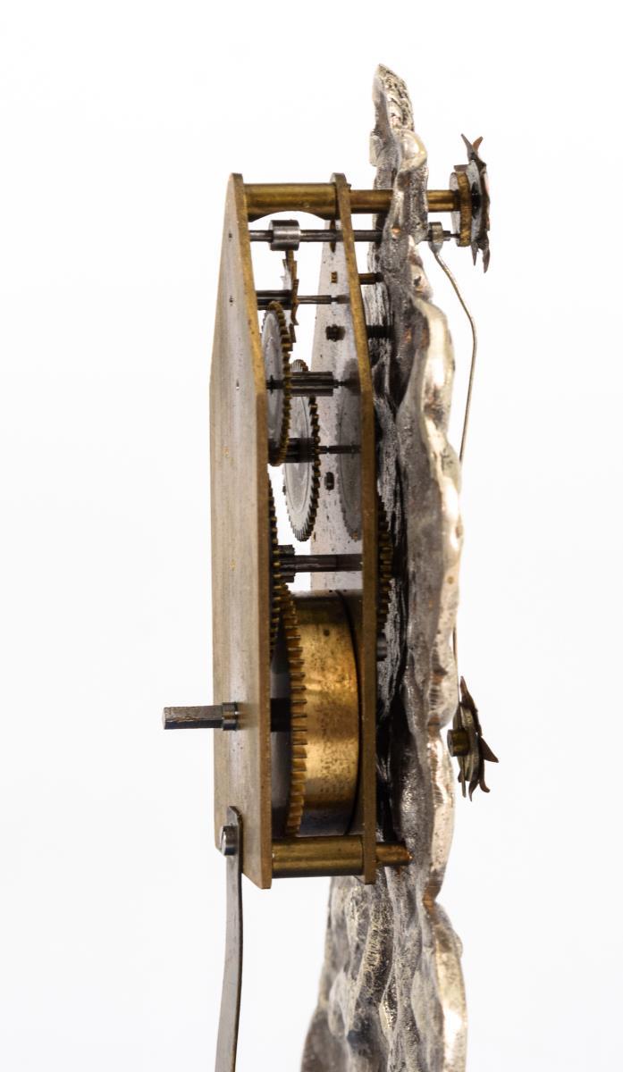 Federwerk mit Kuhschwanzpendel und Schlüsselaufzug. Kupferner Ziffernring mit gravierten römischen Zahlen.
