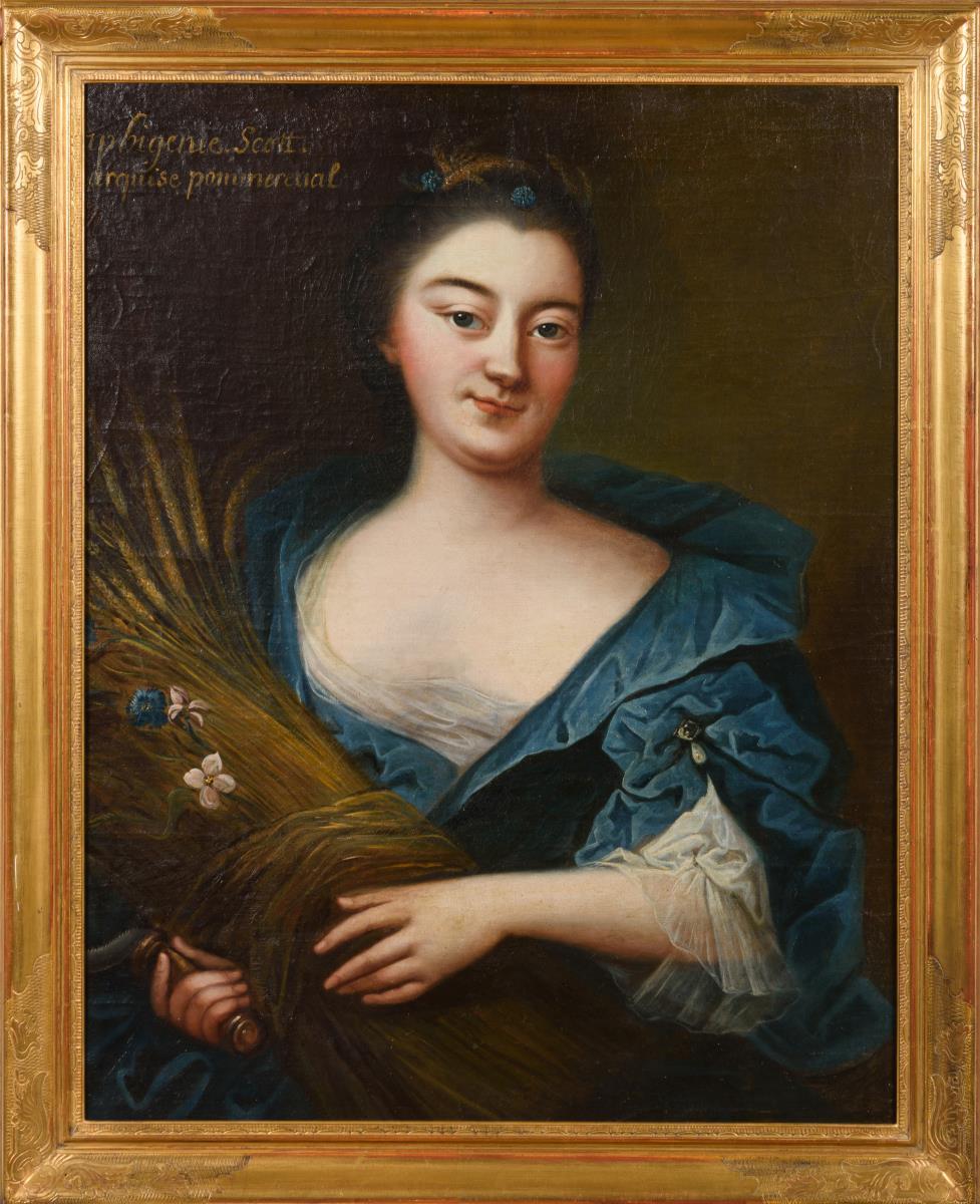 Bildnis der "Iphigenie Scott Marquise pommereual[sic!]" in blauem Kleid mit Ährenbündel. Leinwand doubliert, restauriert.