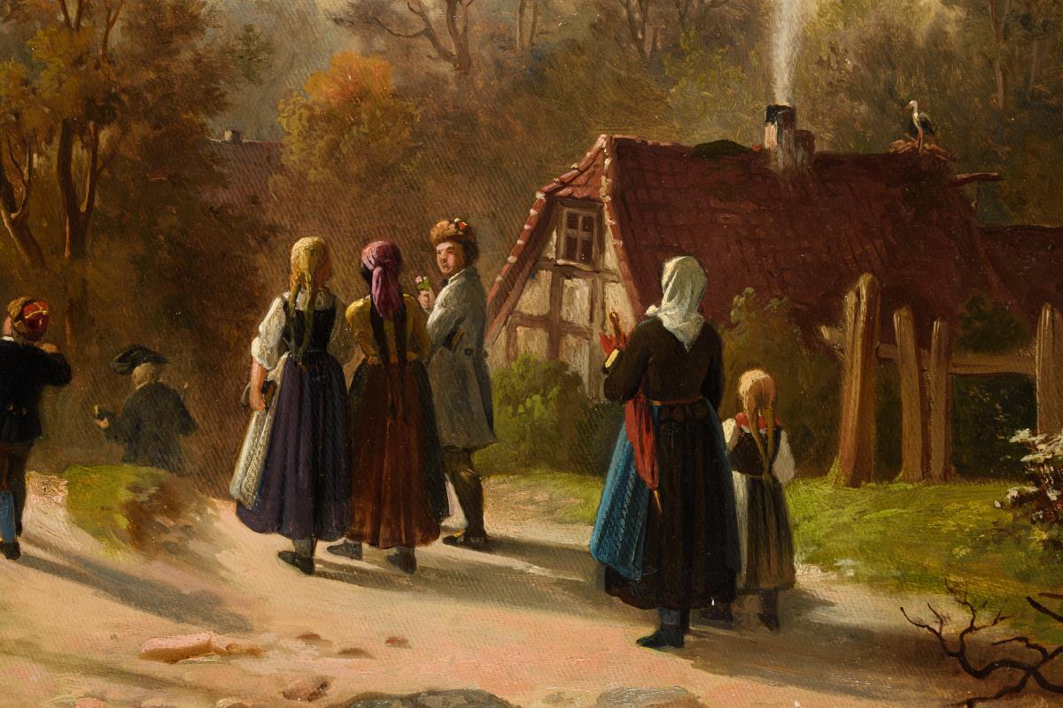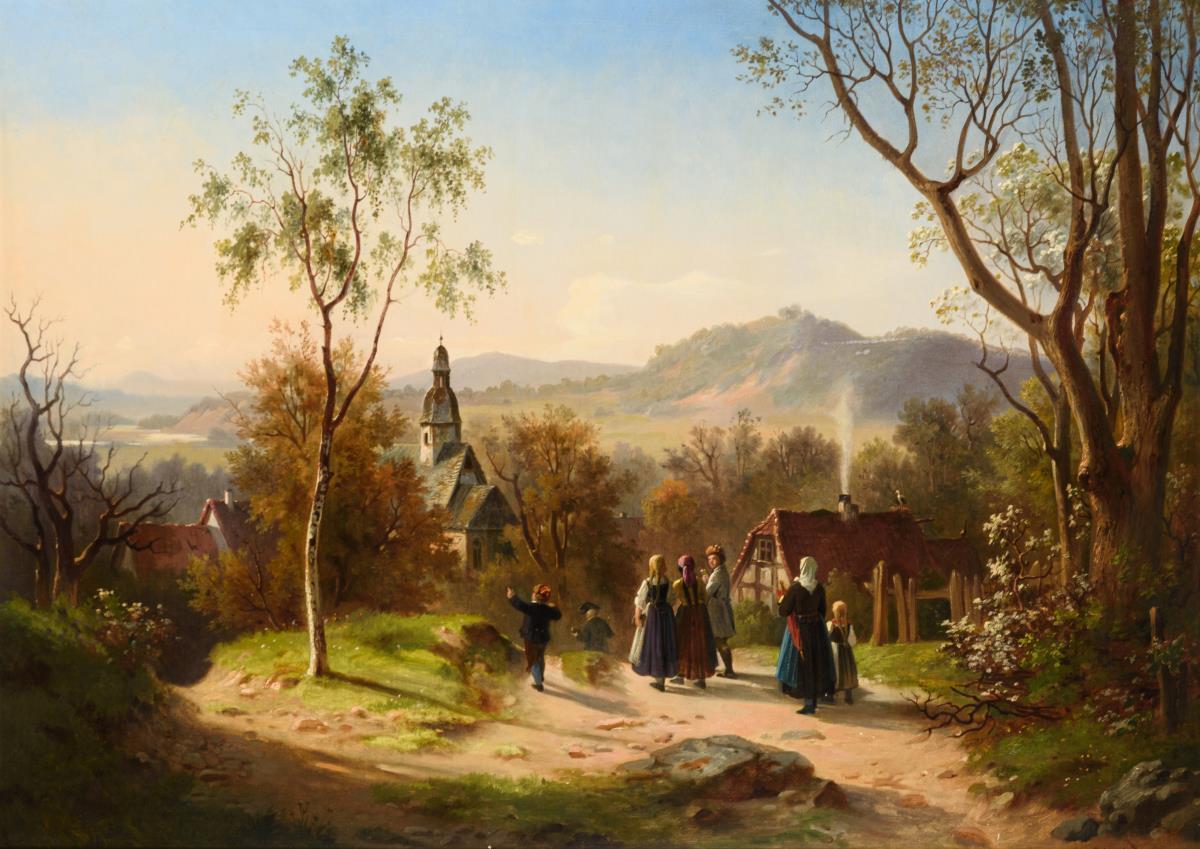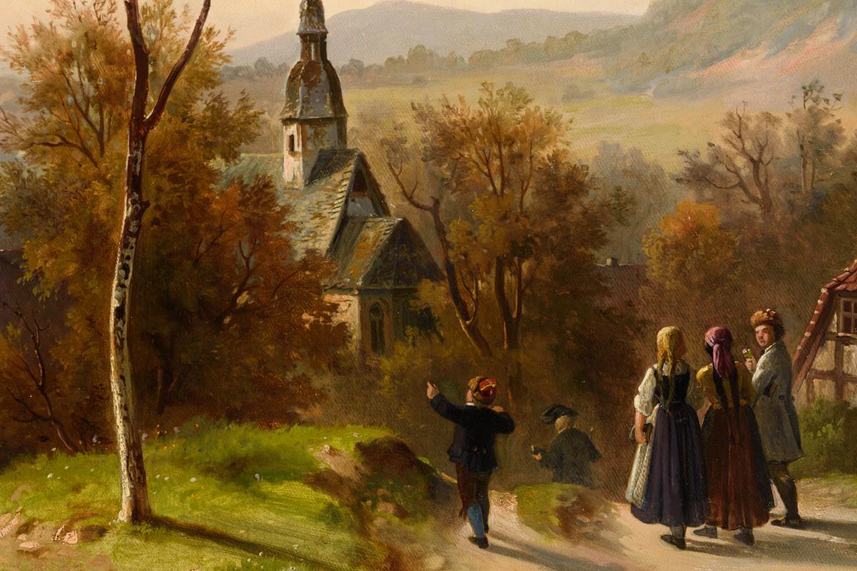 Die Personen auf einem Waldweg in Richtung der Kirche unten im Dorf im idyllischen Sonnenlicht. Leinwand doubliert.