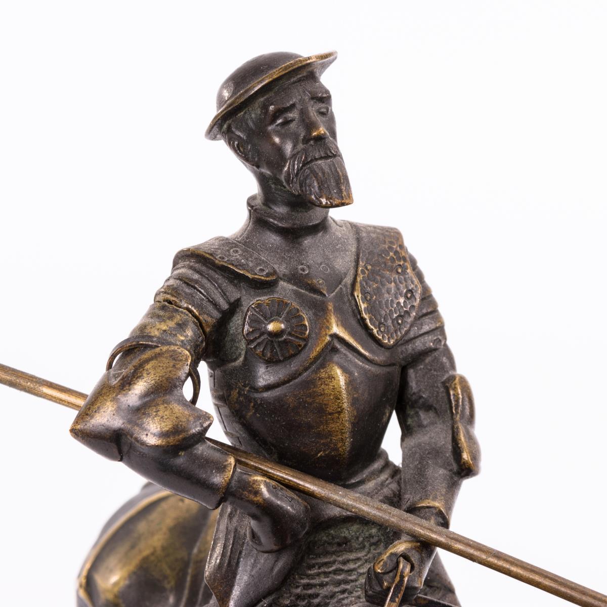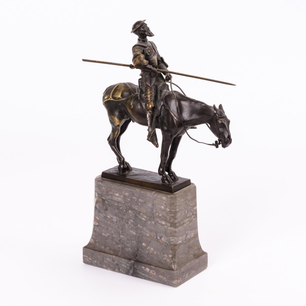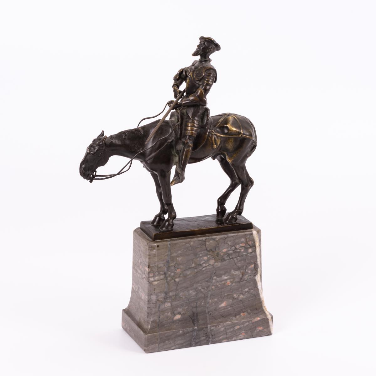 Aufrecht auf dem stehenden Pferd sitzender Ritter. Patina berieben, 1 Pferdebein leicht verbogen, Speer evtl. hinzugefügt.