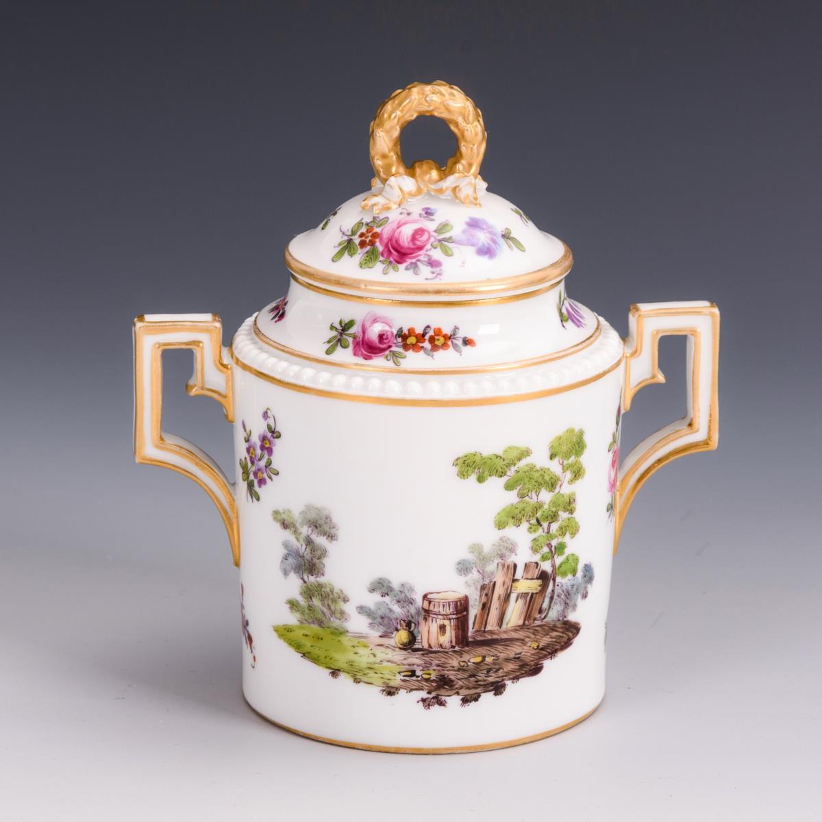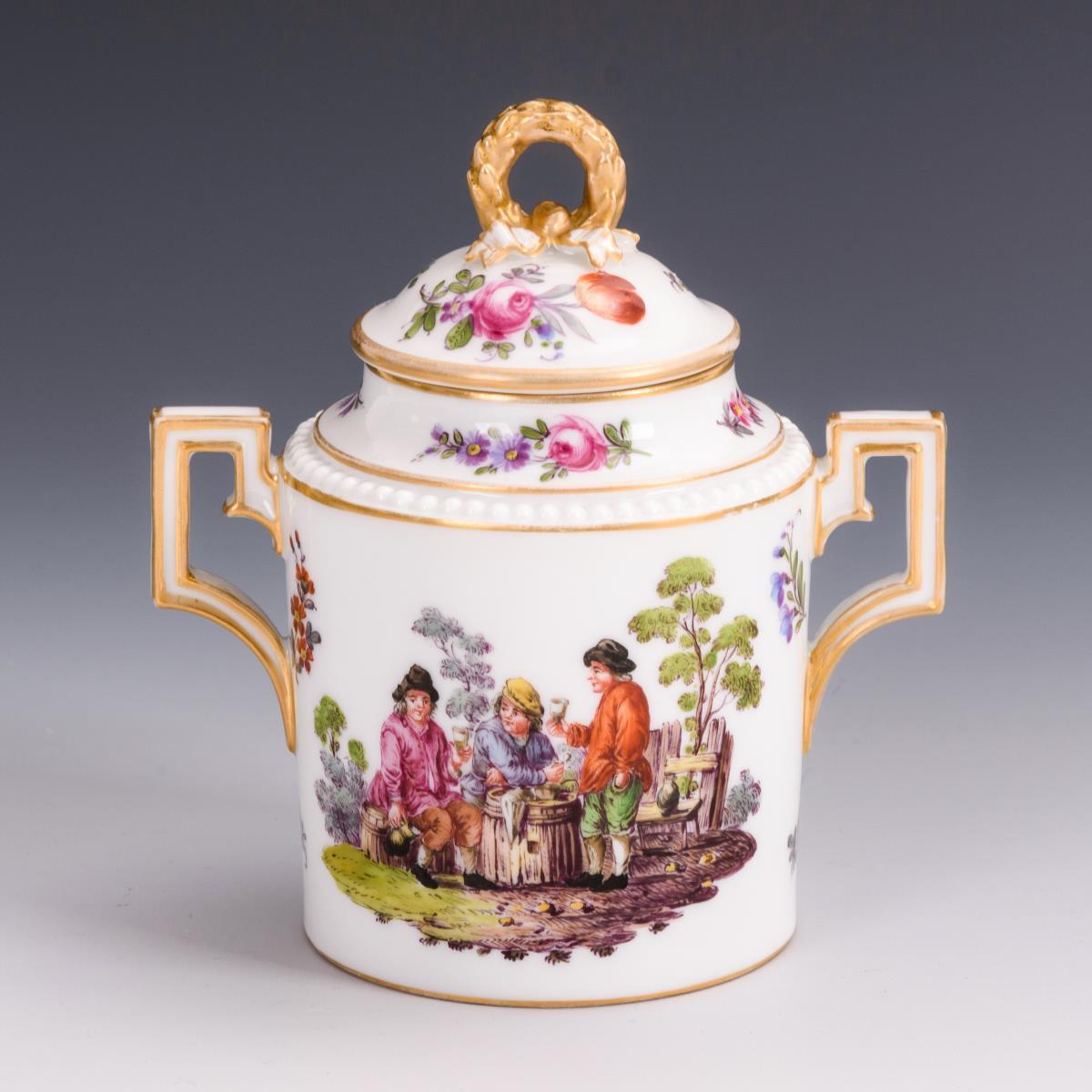 Zylinderdose mit zwei gewinkelten Henkeln, Deckel mit Lorbeerkranzknauf. Schauseitig die Darstellung von drei trinkenden, an einer Tonne sitzenden Bauern. Partiell minimaler Goldabrieb.