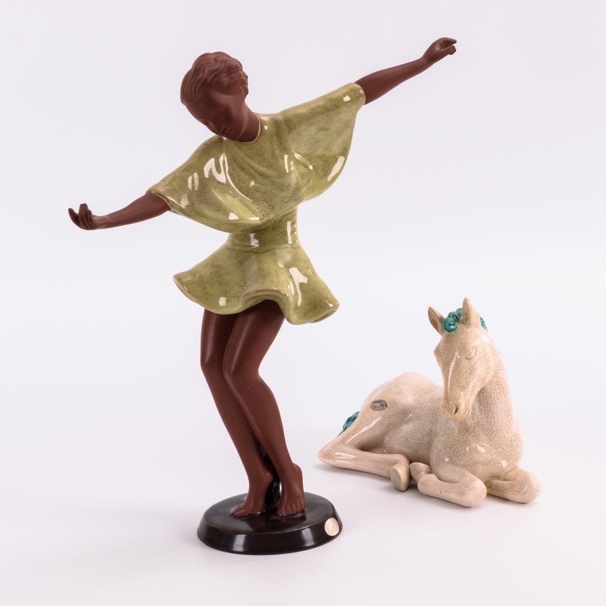 Tänzerin auf Rundsockel: Ca. 1941, Entwurf: Josef Lorenzl, GS WG Pickerl 1a Silber, 1953-60, Modell-Nr. 8713 7, H. 40 cm. Liegendes Pferd: Ca. 1937, Entwurf: Viktor Matula, Stempelmarke GS 19, ca. 1922-41, GS Pick 6, ca. 1922-42, Zusatz "Made in Germany", Modell-Nr. 7780 20, H 18 cm. Linkes Pferdebein geklebt.