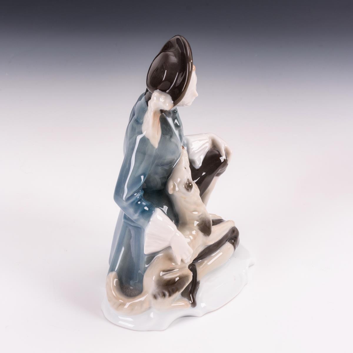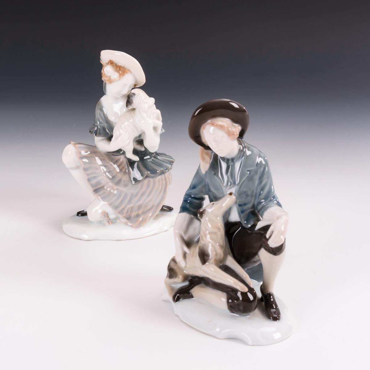 Kniender Mann mit Windhund und kniende junge Frau mit Lämmchen.