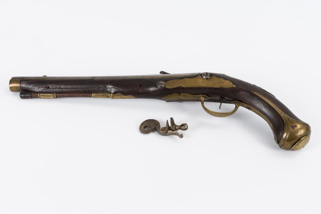 8-kantiger, in rund übergehender Lauf mit Messingkorn, Kaliber 18 mm. Leicht beschnitzter Holzschaft mit Messing-Montierungen. Ladestock ergänzt, Schraube Schnapphahn fehlt. Wohl aus alten Teilen zusammengebaut.