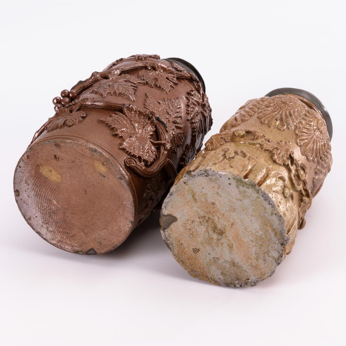 Graubraunes, salzglasiertes Steinzeug, teils lehmbraun engobiert. H 20 und 22,5 cm.