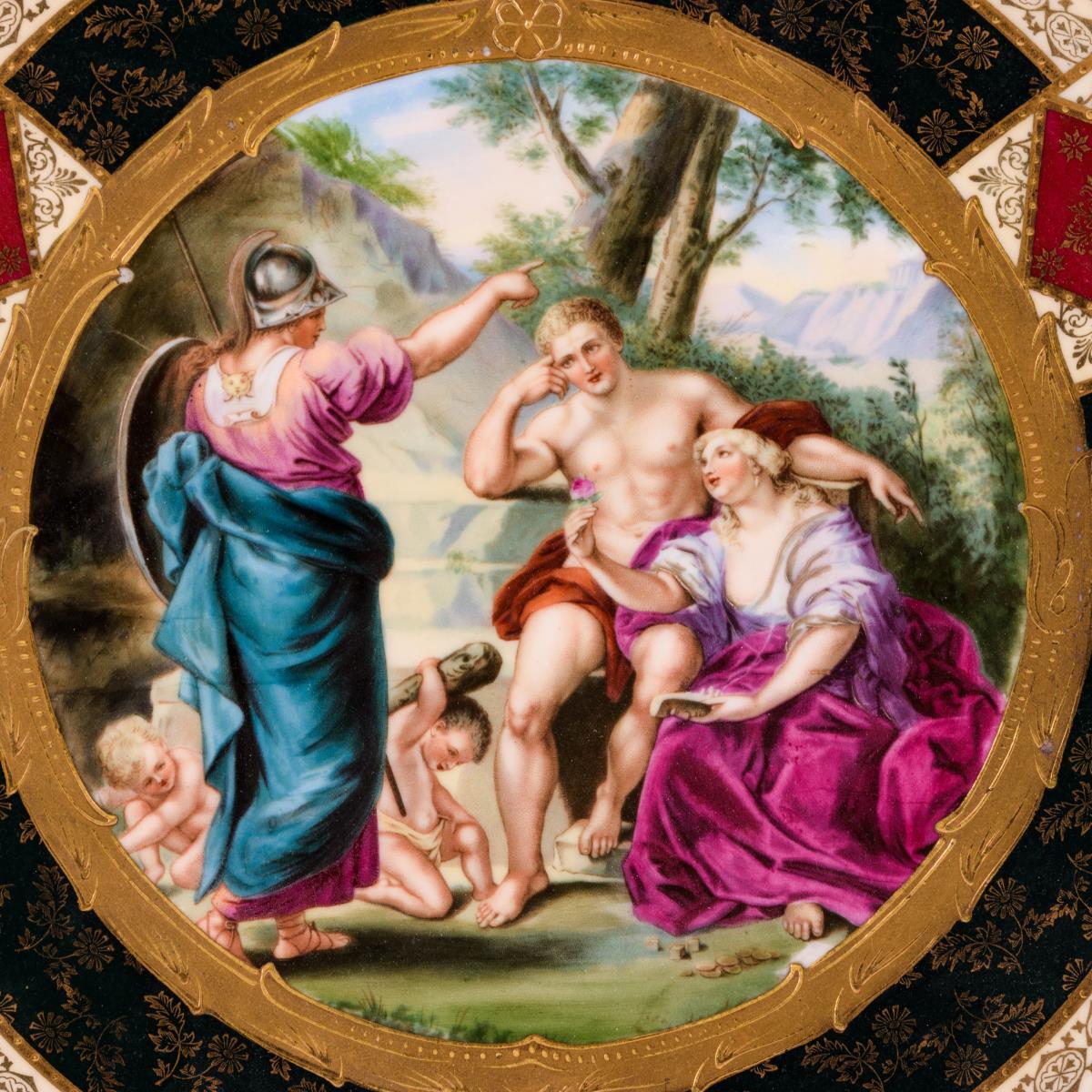Grüner, beigefarbener und bordeauxroter Teilfond. Im Spiegel eine mythologische Darstellung. Minimaler Goldabrieb.