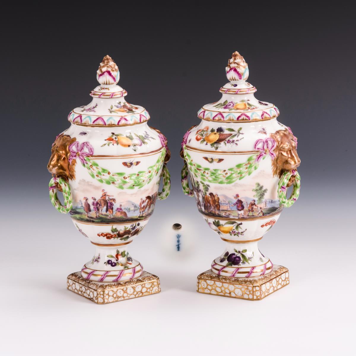 Deckelvasen mit Löwenkopfmaskaron, Lorbeerkranzhenkel, Knaufdeckel. Umlaufend reiche Figurenmalerei mit Pferden. Minimaler Goldabrieb.
