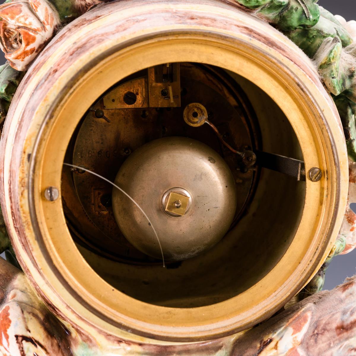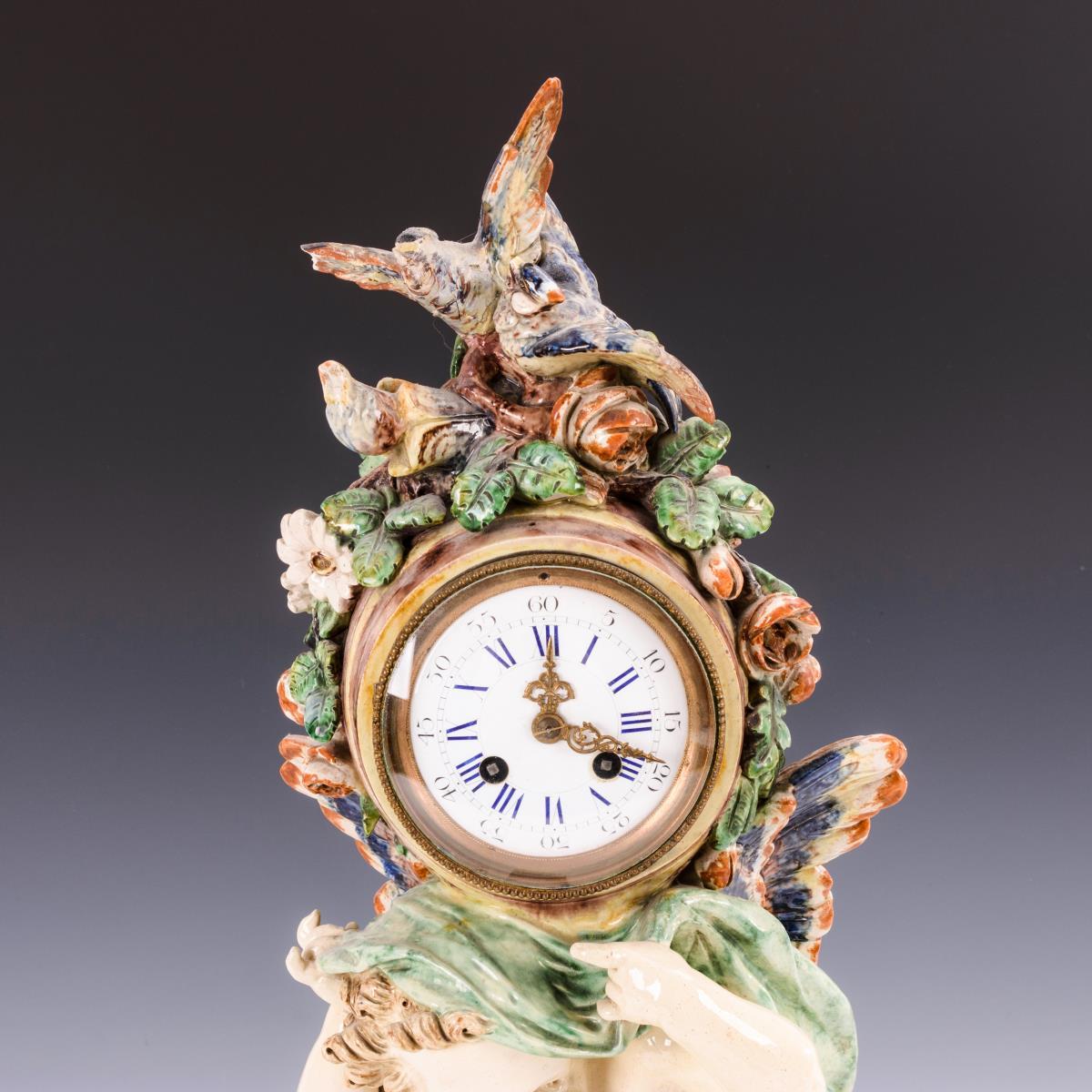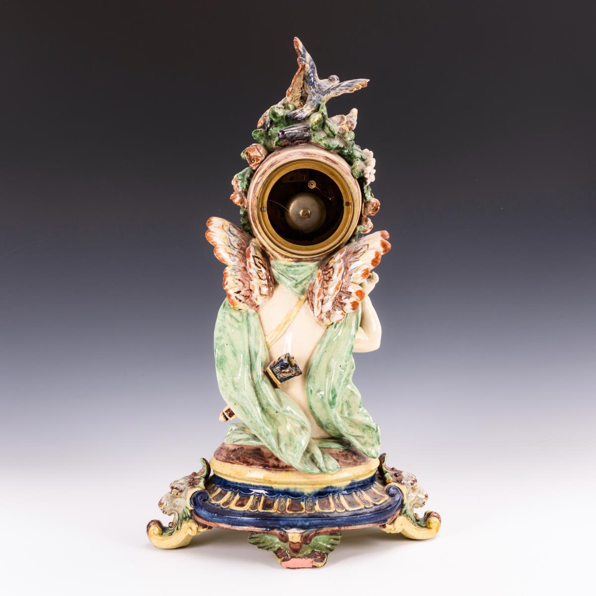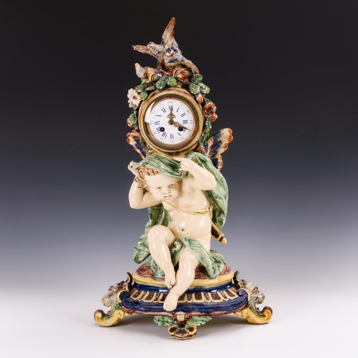 Historismus-Uhr mit profiliertem Sockel und plastischem Putto als Uhrenträger, Taubenbekrönung und Rosengirlanden. Verglastes weißes Emailzifferblatt mit blauen römischen Stunden und schwarzen arabischen Minuten, Minutenkranz und Louis Seize-Zeigern. "Japy Frères" gemarktes Werk mit Halbstundenschlag auf Glocke, läuft, ohne Schlüssel und Pendel. Klebestellen, Restaurierungen, Defekte (u. a. 1 Fuß stark bestoßen).