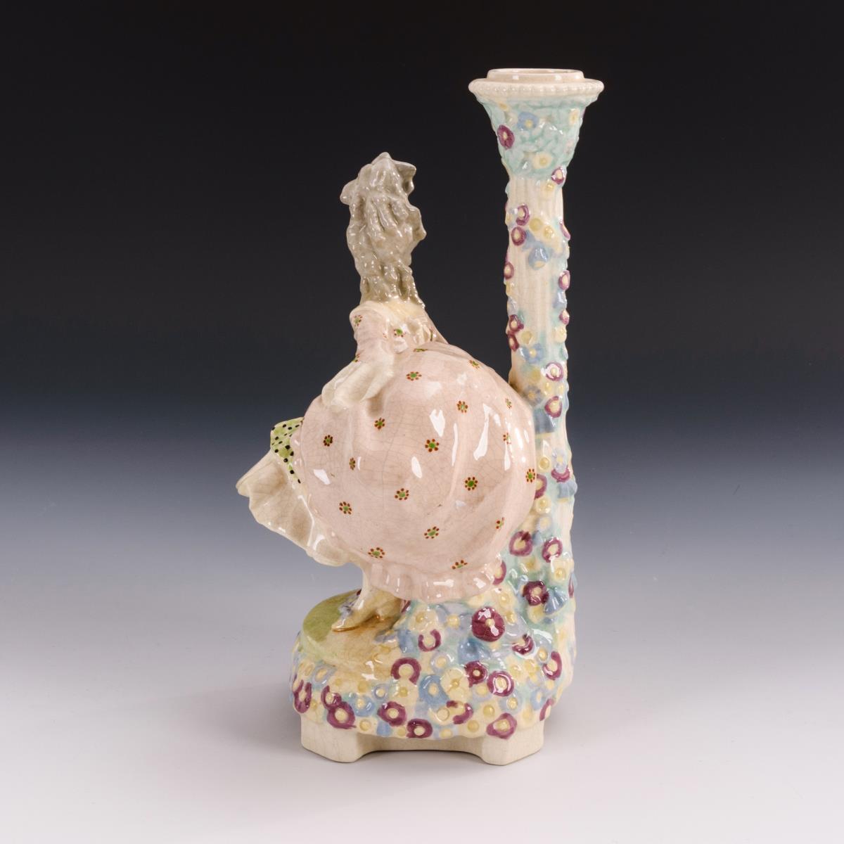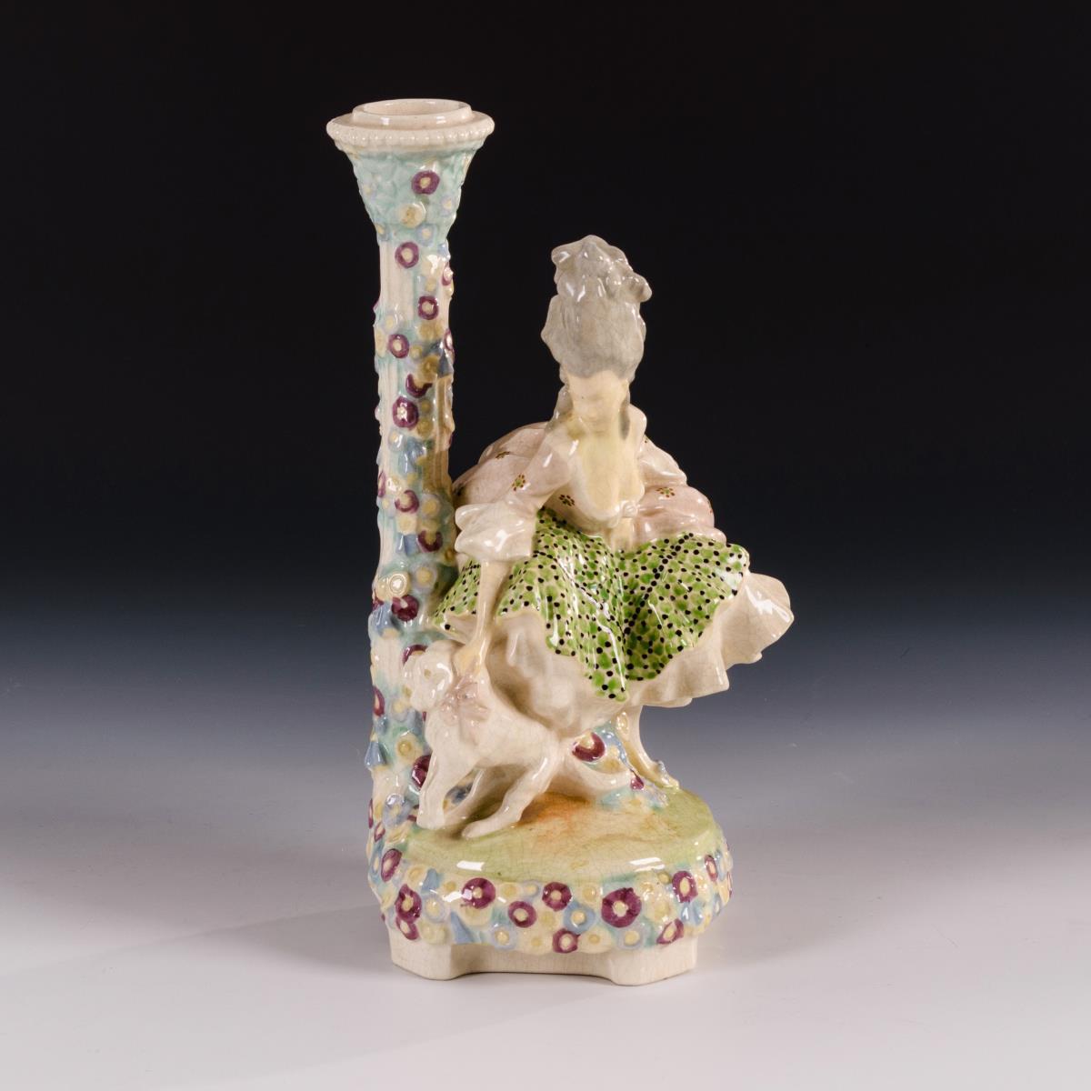 Rokoko-Dame mit Hündchen und geblümter Säule als Kerzenleuchter. Wiener Kunstkeramische Werkstätte Busch & Ludescher.