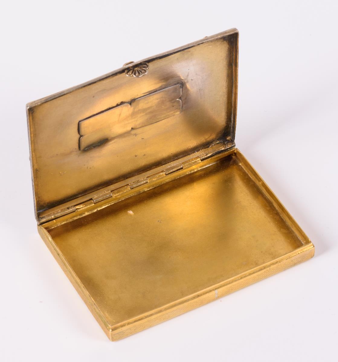 Auf dem Scharnierdeckel erhabene Zentralraute aus blauem Email mit applizierter, edelsteinbesetzter Schleife. Deckelfläche mit Filigran-Ornament sowie Edelstein- und Perlenbesatz. Boden guillochiert. Einige wenige Alters-/Gebrauchsspuren.