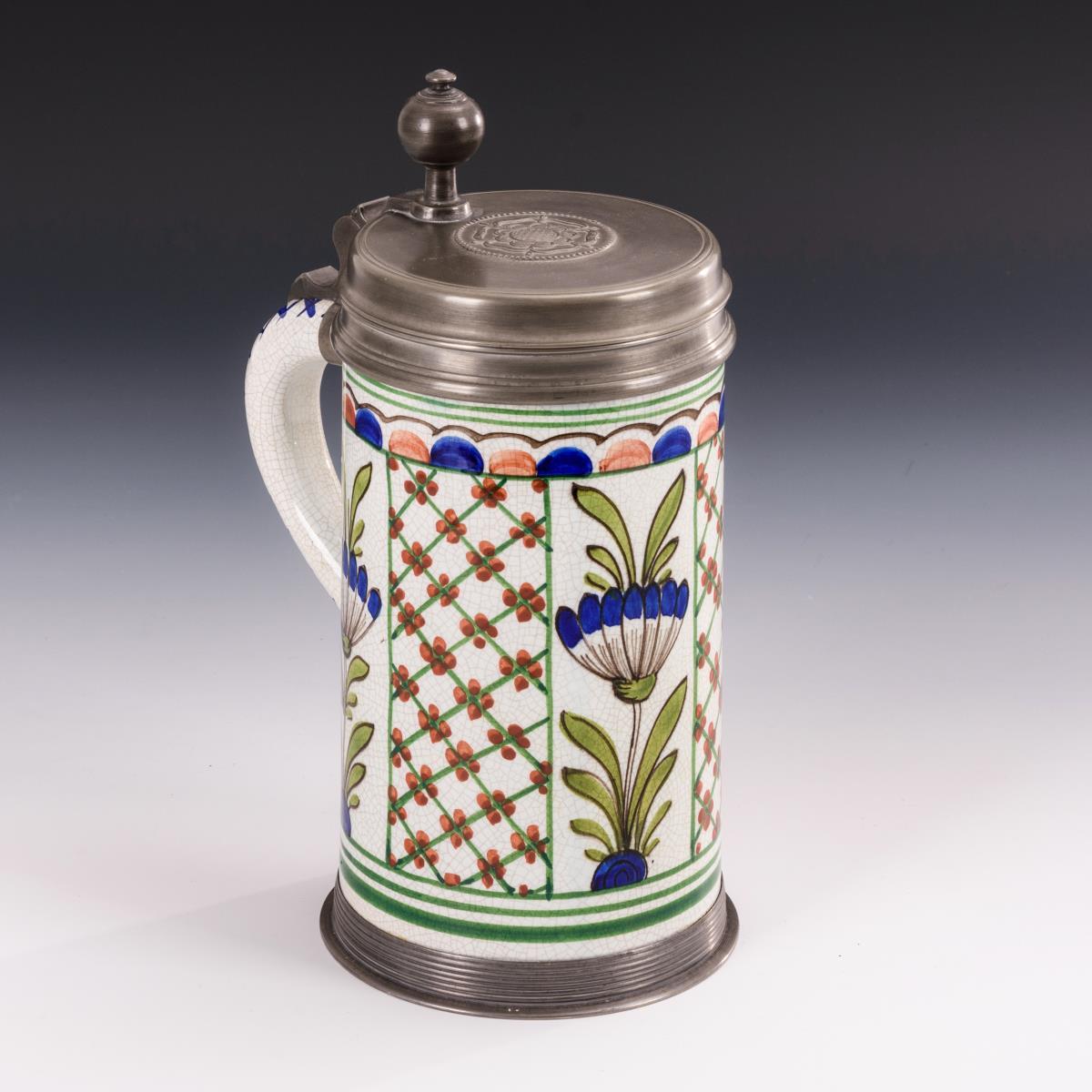Fayence-Walzenkrug mit Pilasterdekor und großen Blumen.