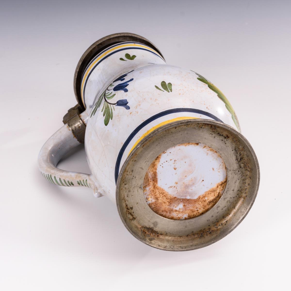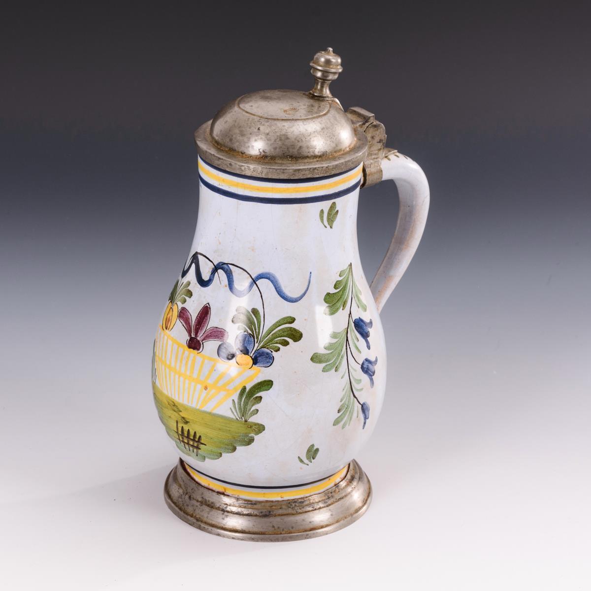 Schauseitig ein Blumenkorb auf Grassockel und ein blaues Wellenband. Gewölbter Zinndeckel mit Kugeldrücker, Zinnstandring. Zinn mit leichten Alters- und Gebrauchsspuren.