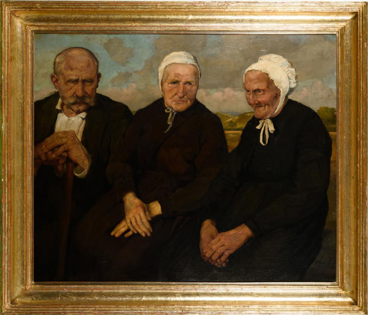 Altes Bauernpaar mit der Großmutter auf einer Bank im Freien. Leichte Altersspuren.