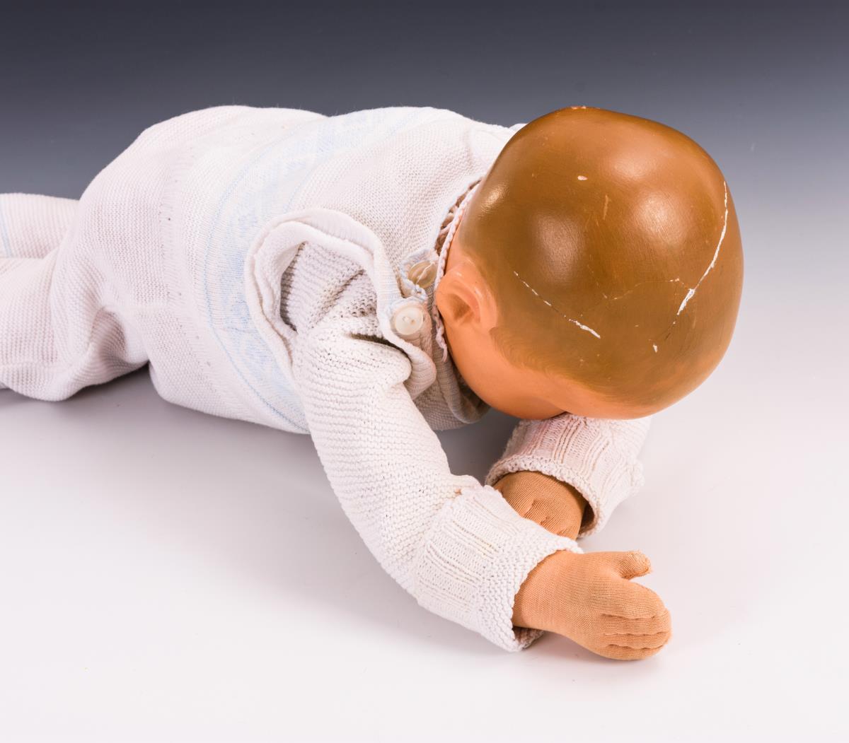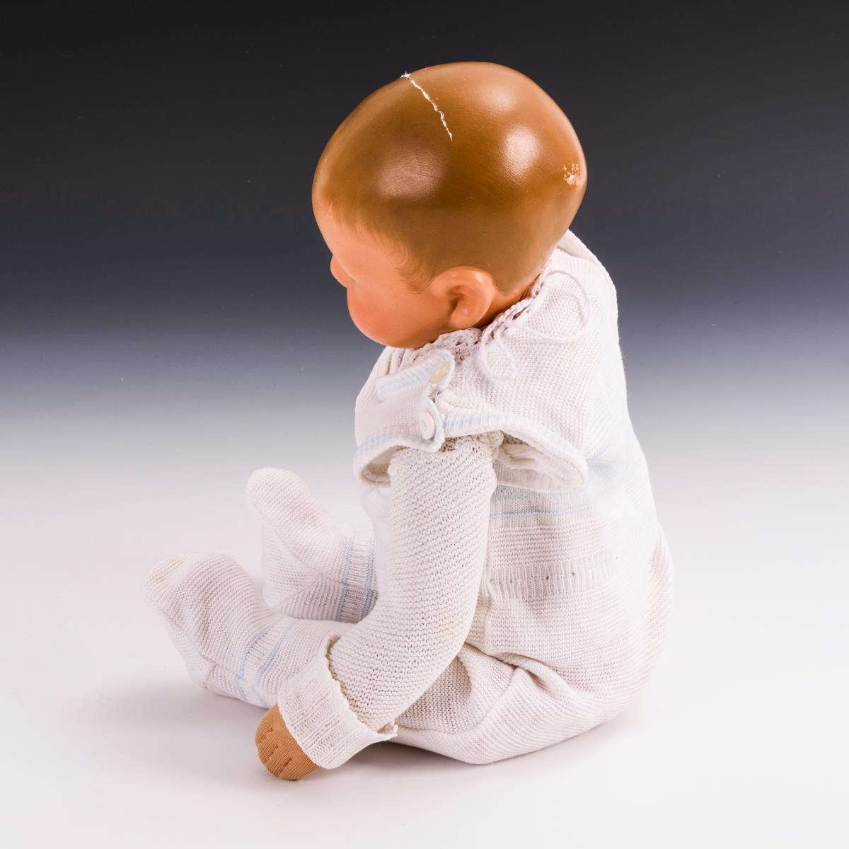 Bemalter Magnesitkopf mit geschlossenen Augen und gemalten Haaren. Trikotkörper mit Bauchnabel und Poloch. Weißer Strampler und Jüpchen. Kopf und linker Daumen mit Defekten.