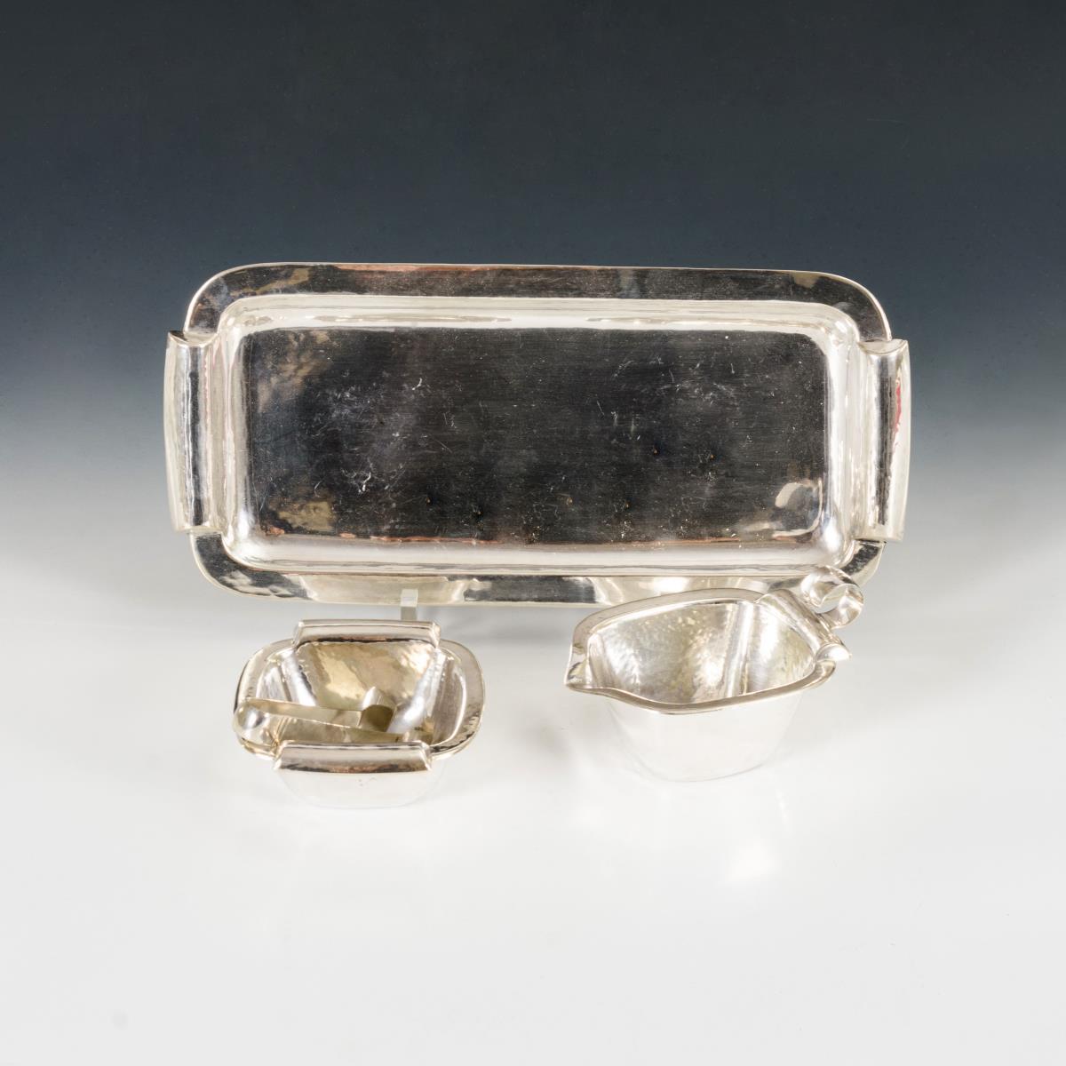 Handgetriebenes Art-déco-Set mit Zuckerzange, auf Tablett.