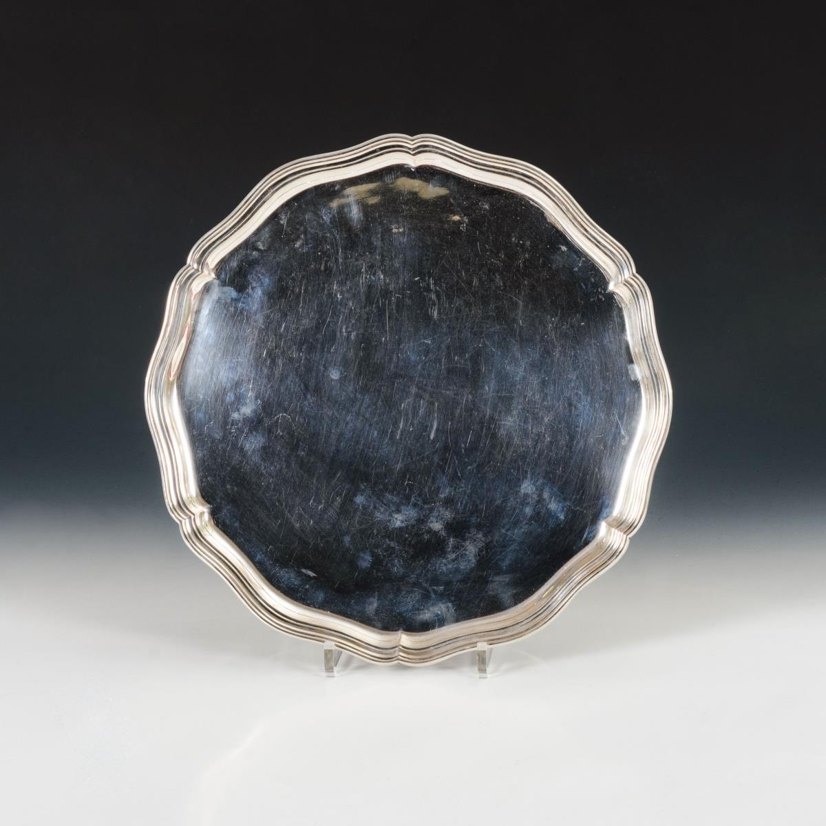 Flaches Tablett mit geschweiftem Profilrand im Barockstil. Gebrauchsspuren.