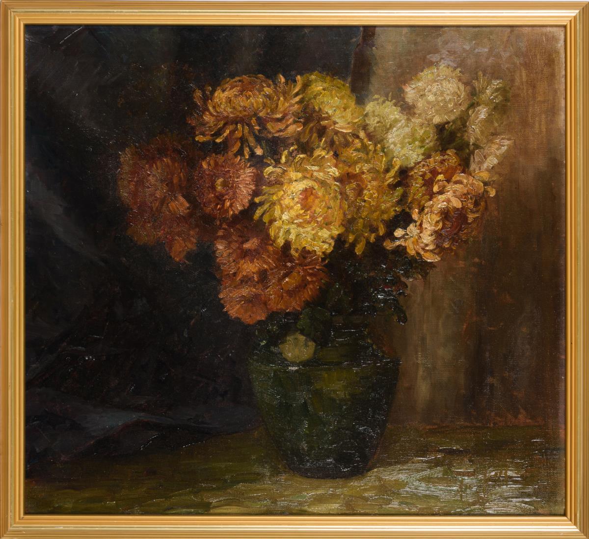 Chrysanthemen in grüner Vase vor dunklem Vorhang.