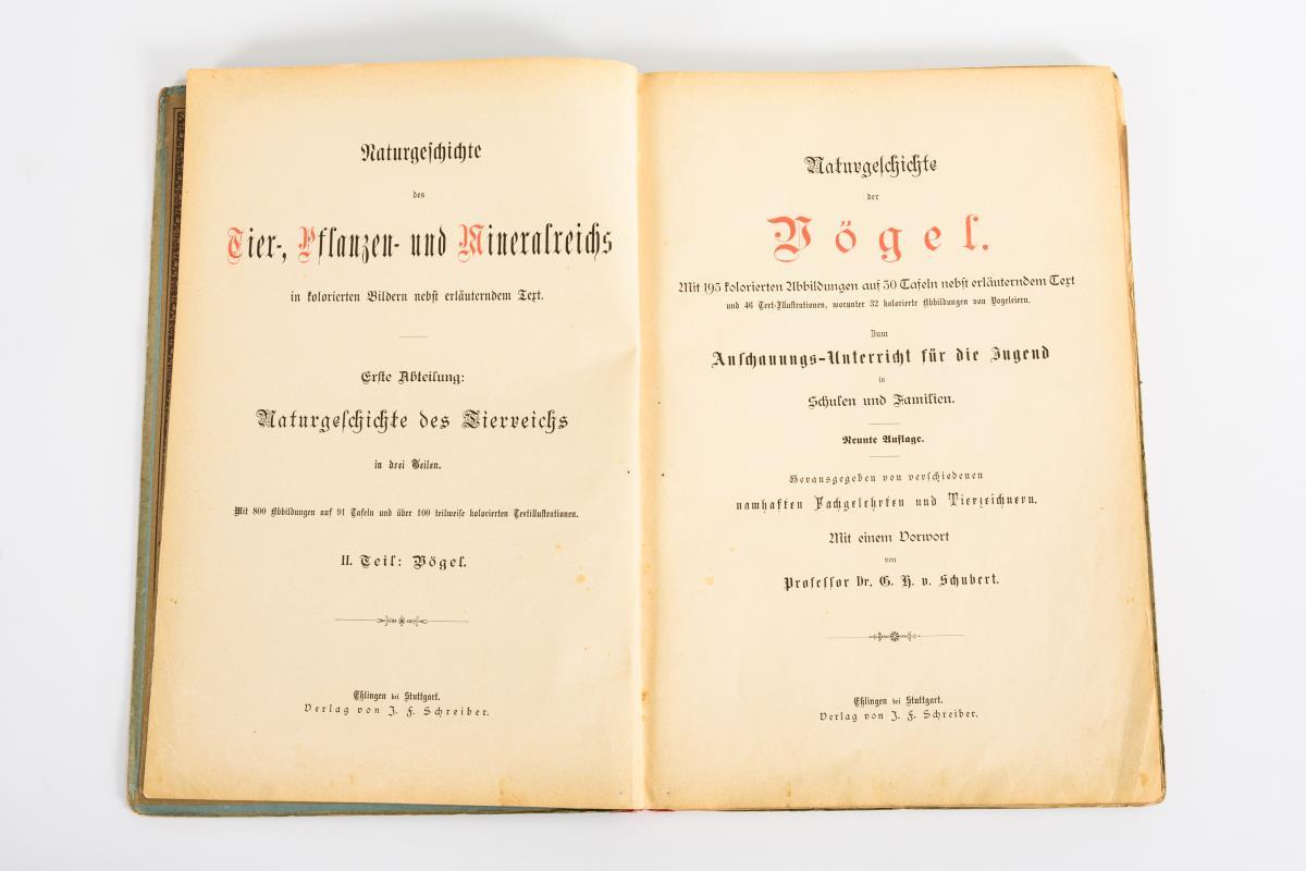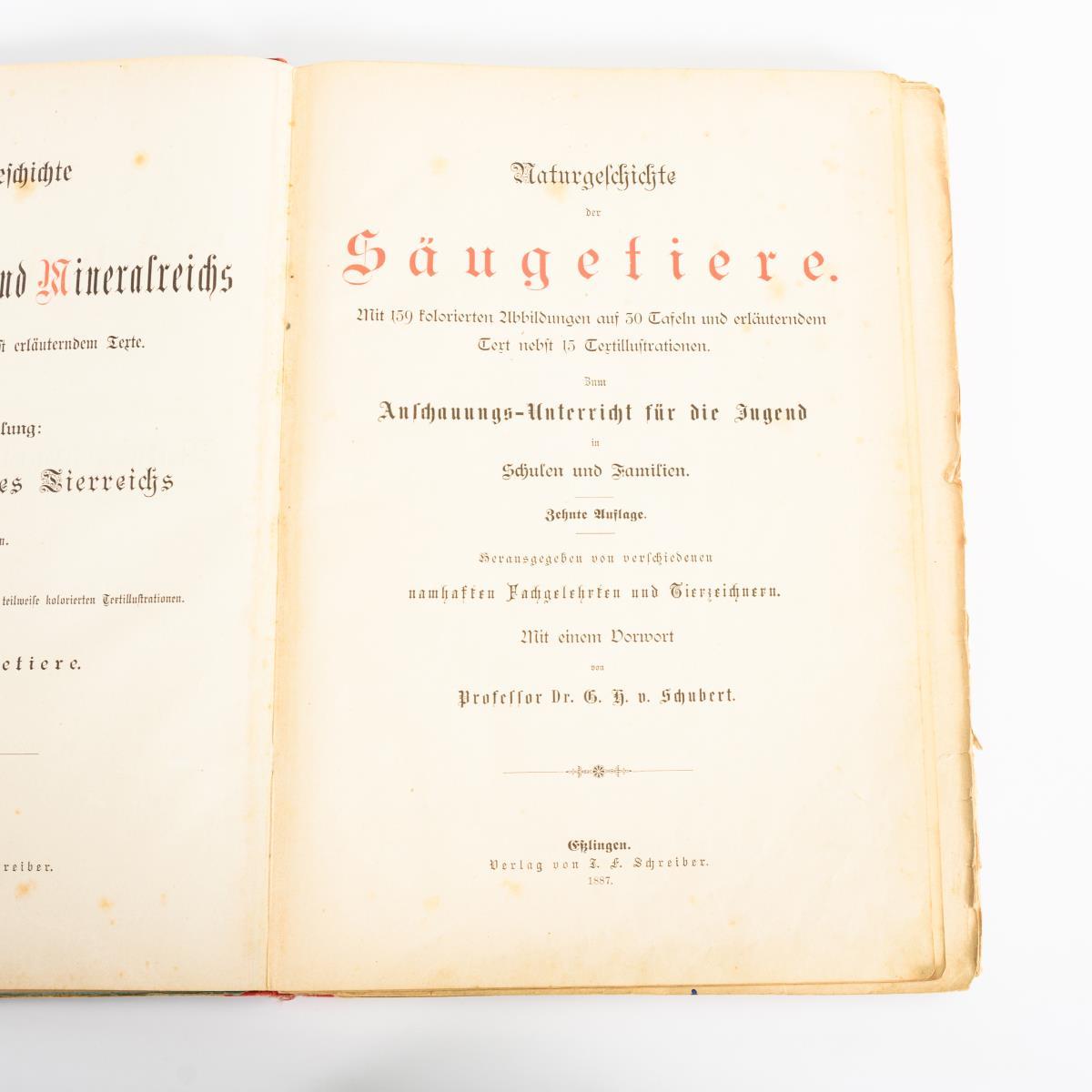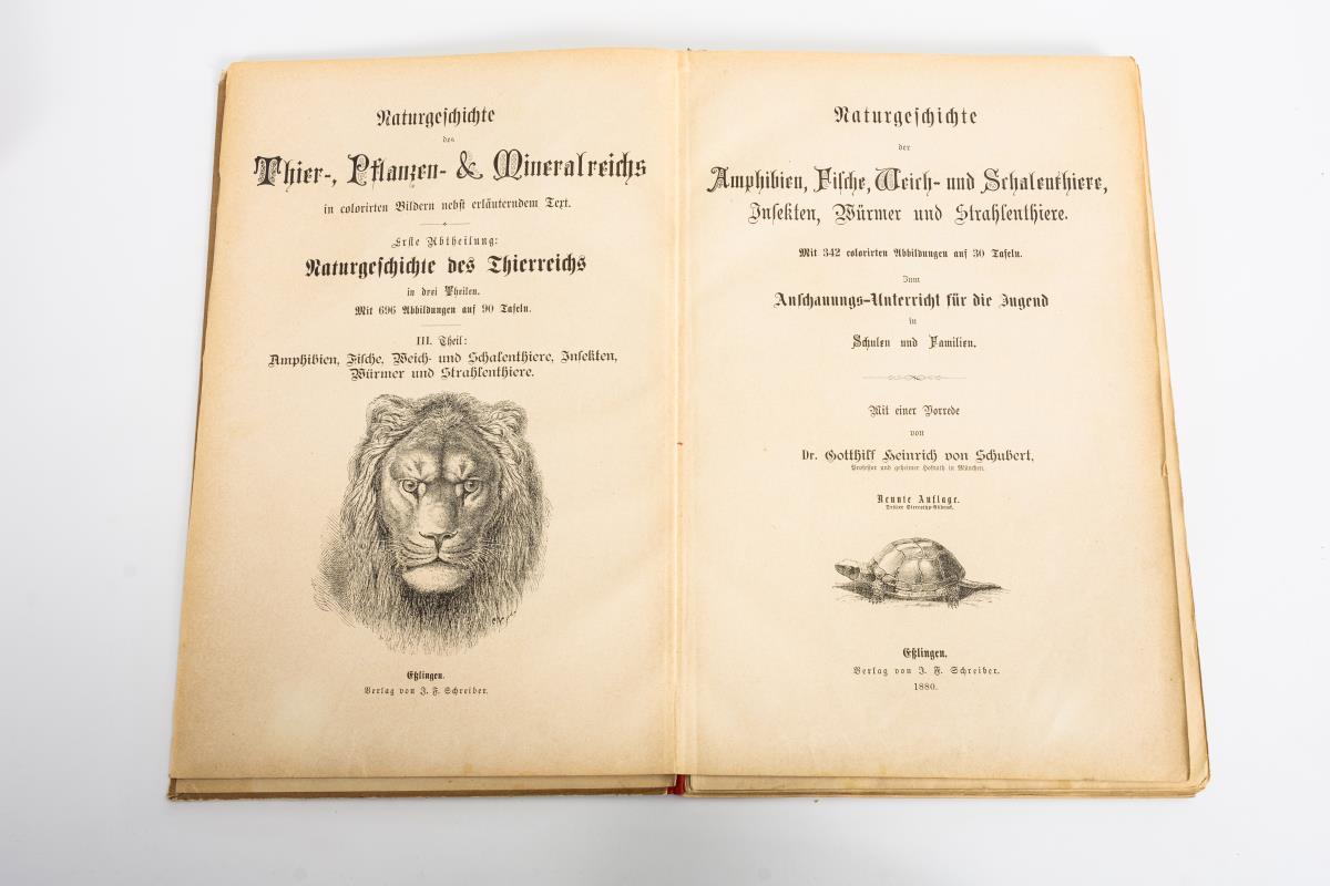 Naturgeschichte der Säugethiere"; "Naturgeschichte der Vögel" und "Naturgeschichte der Amphibien, Fische, Weich- und Schalenthiere, Insekten, Würmer und Strahlenthiere". Alle mit zahlreichen Farblithographien, Halbleineneinband. Starke Gebrauchsspuren, Seiten lose.