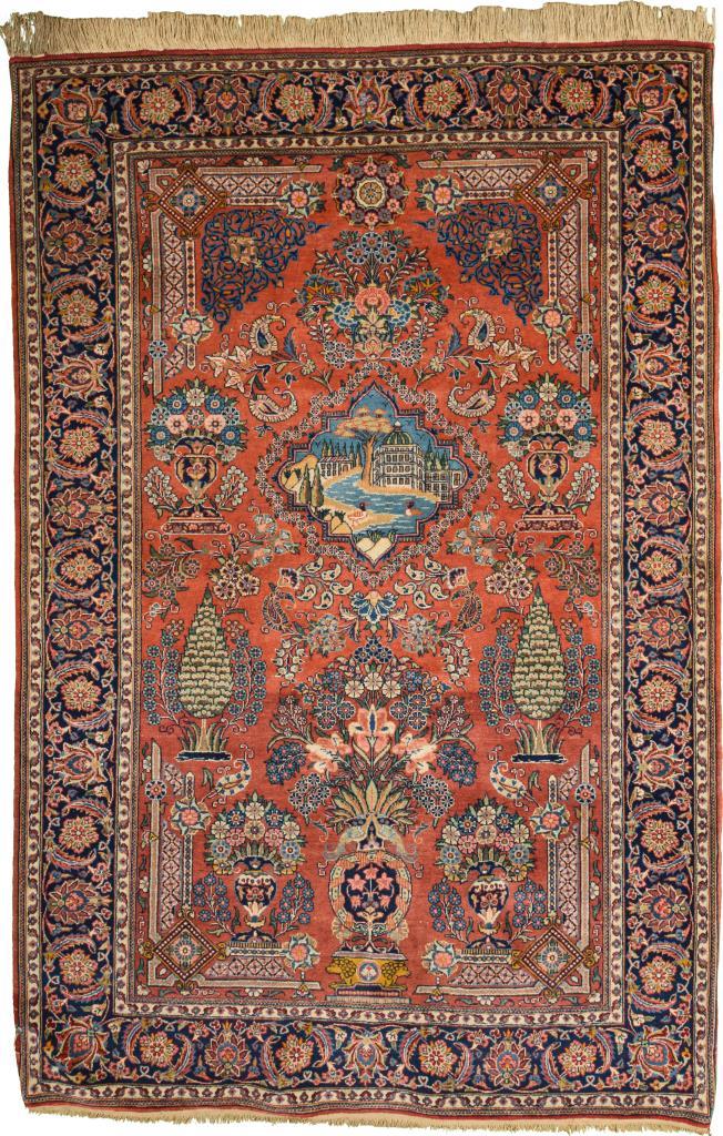 Sorgfältig ausgeführter Manufakturteppich mit Vasen- und Baummotiven, Arabesken und einer zentralen Bildkartusche mit der Darstellung einer Landschaft mit Palastarchitektur. Herati-Bordüre. Verso Ringaufhängung. Leicht fleckig, Florschaden in Bordüre oben.