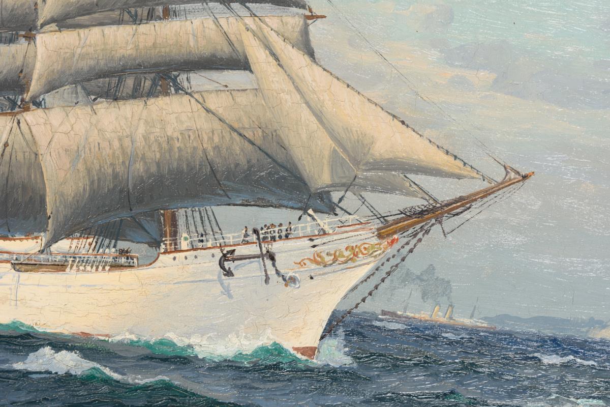 Vollschiff im Sonnenschein nahe einer Steilküste. Leinwand doubliert.