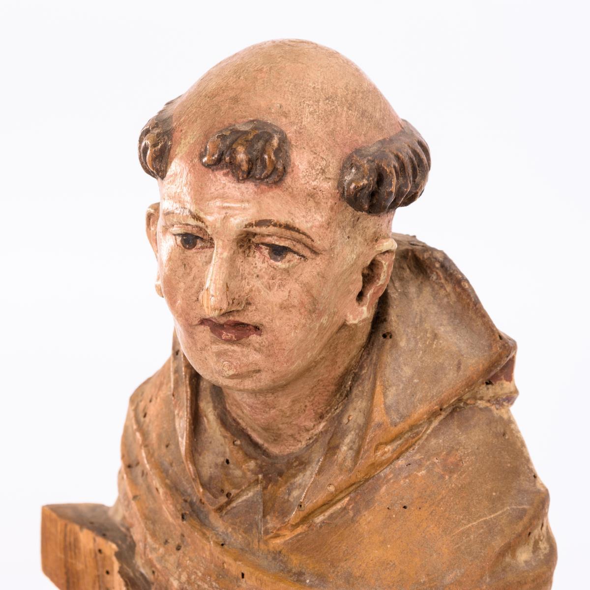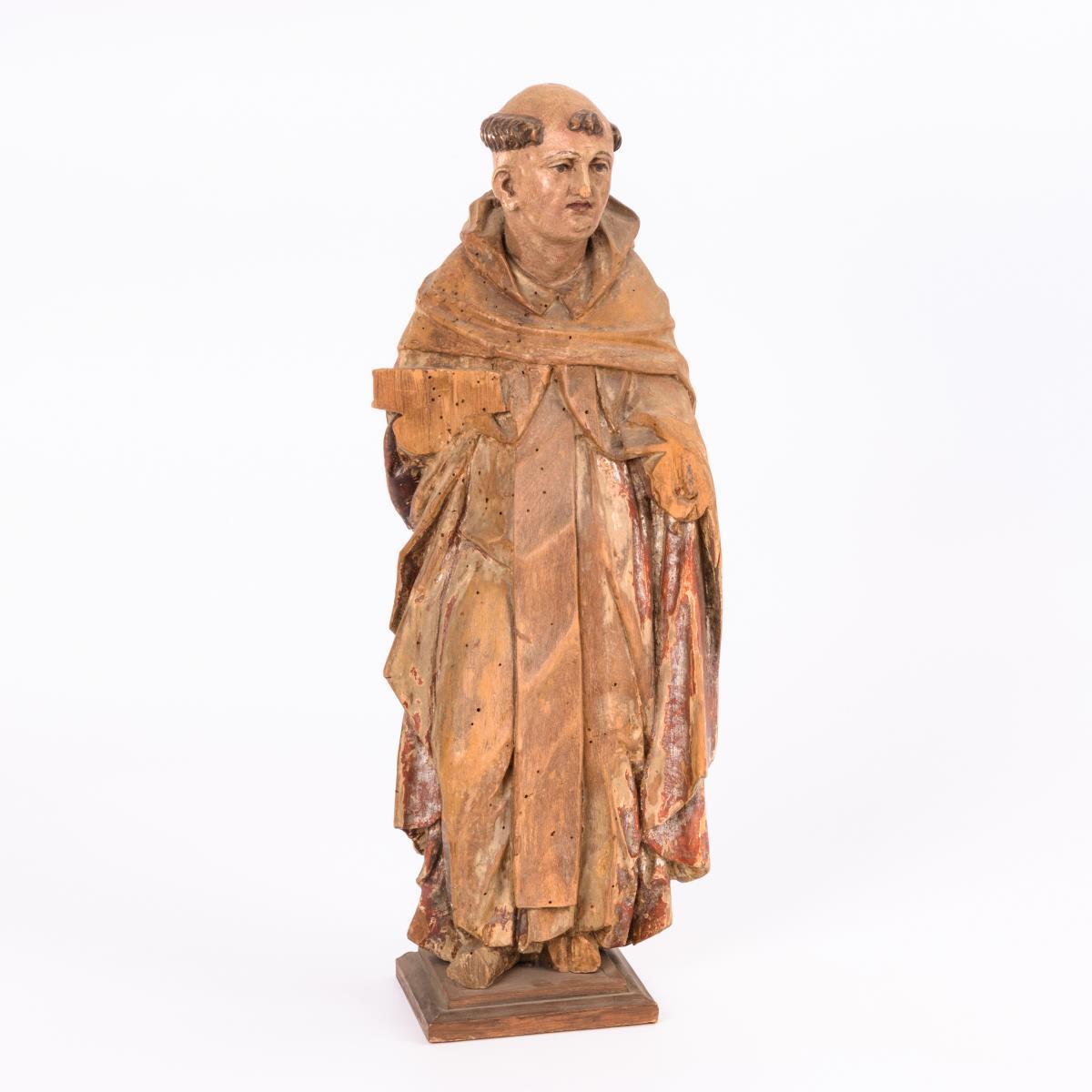 Im Kontrapost stehender Mönch mit Tonsur. Fehlteile, Anobienspuren, Fassung teils übergangen, Plinthe ergänzt.