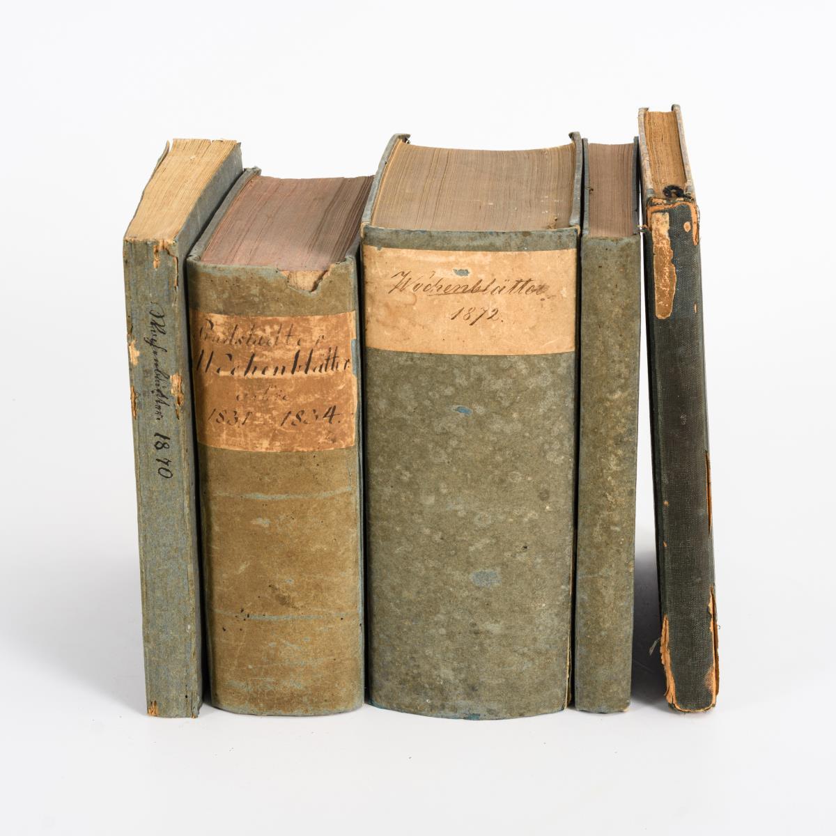 "Fürstlich Schwarzburg-Rudolstädtische privilegierte Zeitung Wochenblatt". 1831, 1857, 1870, 1872 (104. Jahrgang). / "Der Sonntagsgast - Unterhaltungs-Beilage der 'Rudolstädter Zeitung'", 1883-1885. Alle im festen Einband. Mit altersgemäßen Gebrauchsspuren.