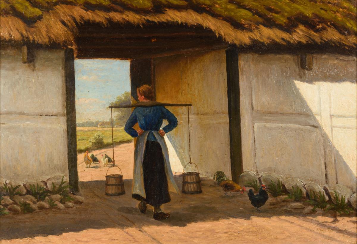 Junge Magd mit Wassereimern im Schatten des Hoftors.