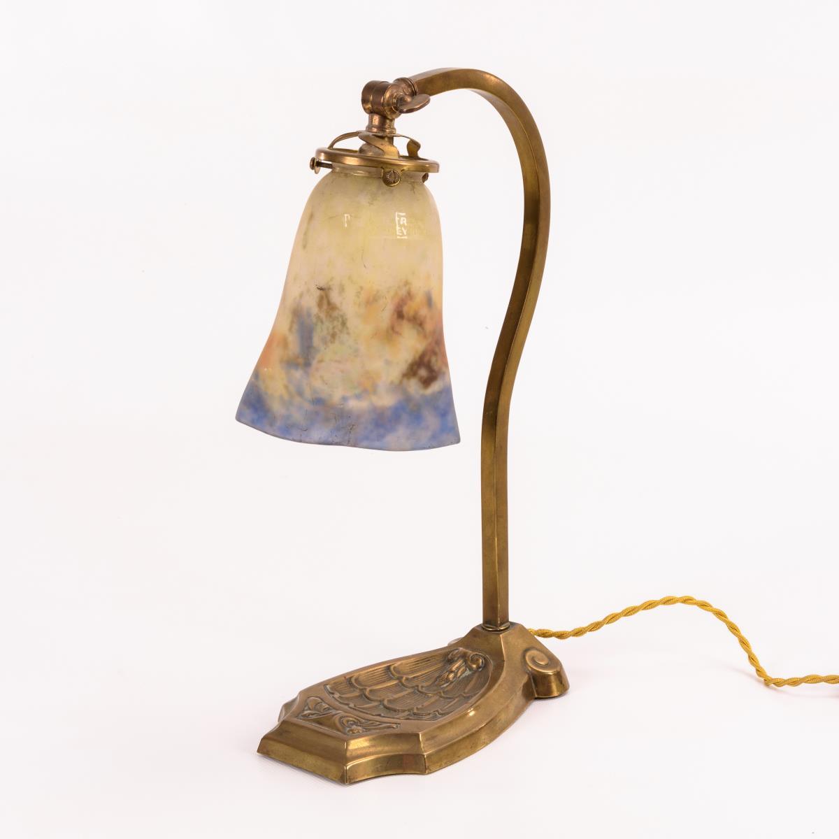 Farbloses, mattiertes Glas mit blauen, opalweißen, orangen und braunen Pulvereinschmelzungen; Bronze. H 35 cm, L Schirm 14,5 cm.