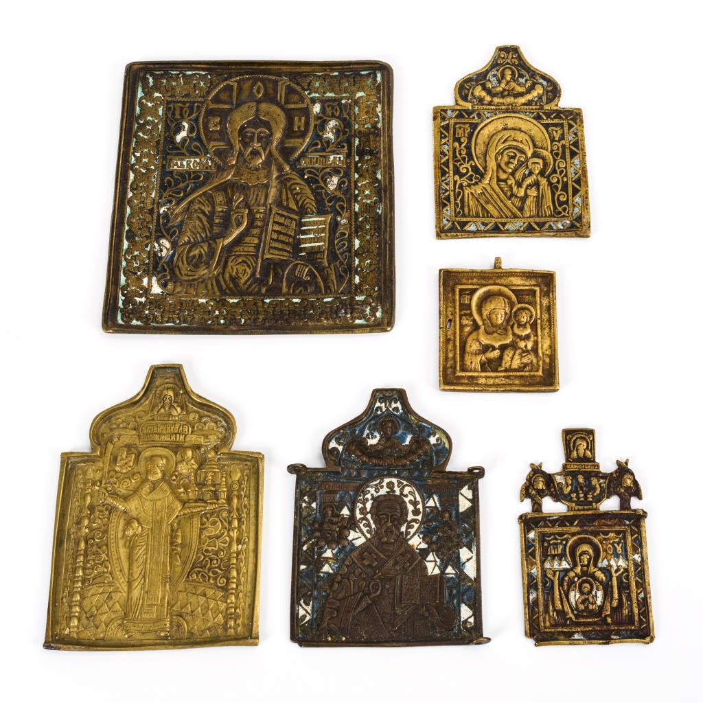 Christus Pantokrator, St. Nikolaus, St. Nikolaus Mozhaisk, 3x Madonna. Teils fehlende Scharniere und Seitenflügel, teils stärkere Alters-/Gebrauchsspuren.