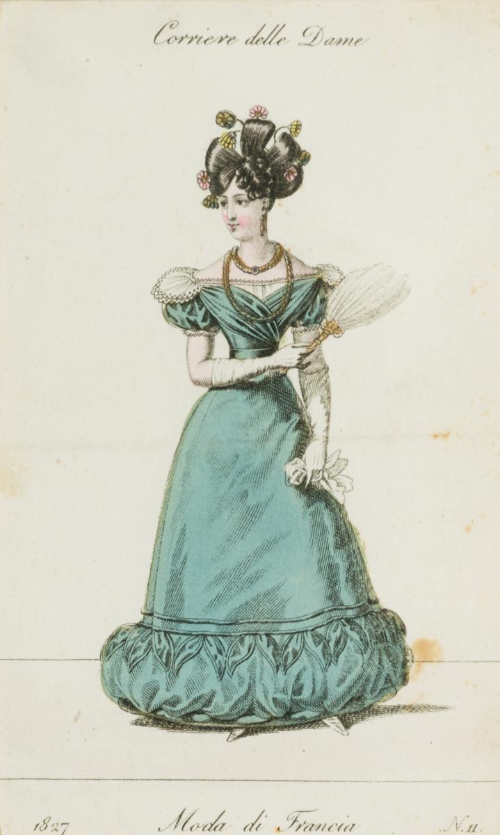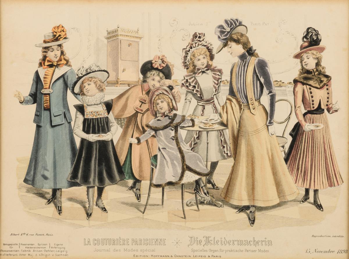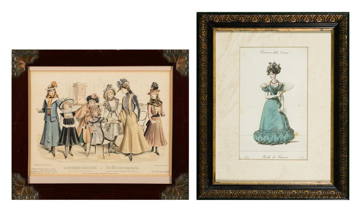 1 Illustration mit Damen- und Mädchenmode aus "La Couturière Parisienne. Journal des Modes spécial", 1898, Rahmen: 34 x 40 cm | 1 mit französischer Damenmode "Corriere delle Dame - Moda di Francia", 1827, Rahmen: 33 x 27 cm. Etwas stockfleckig.