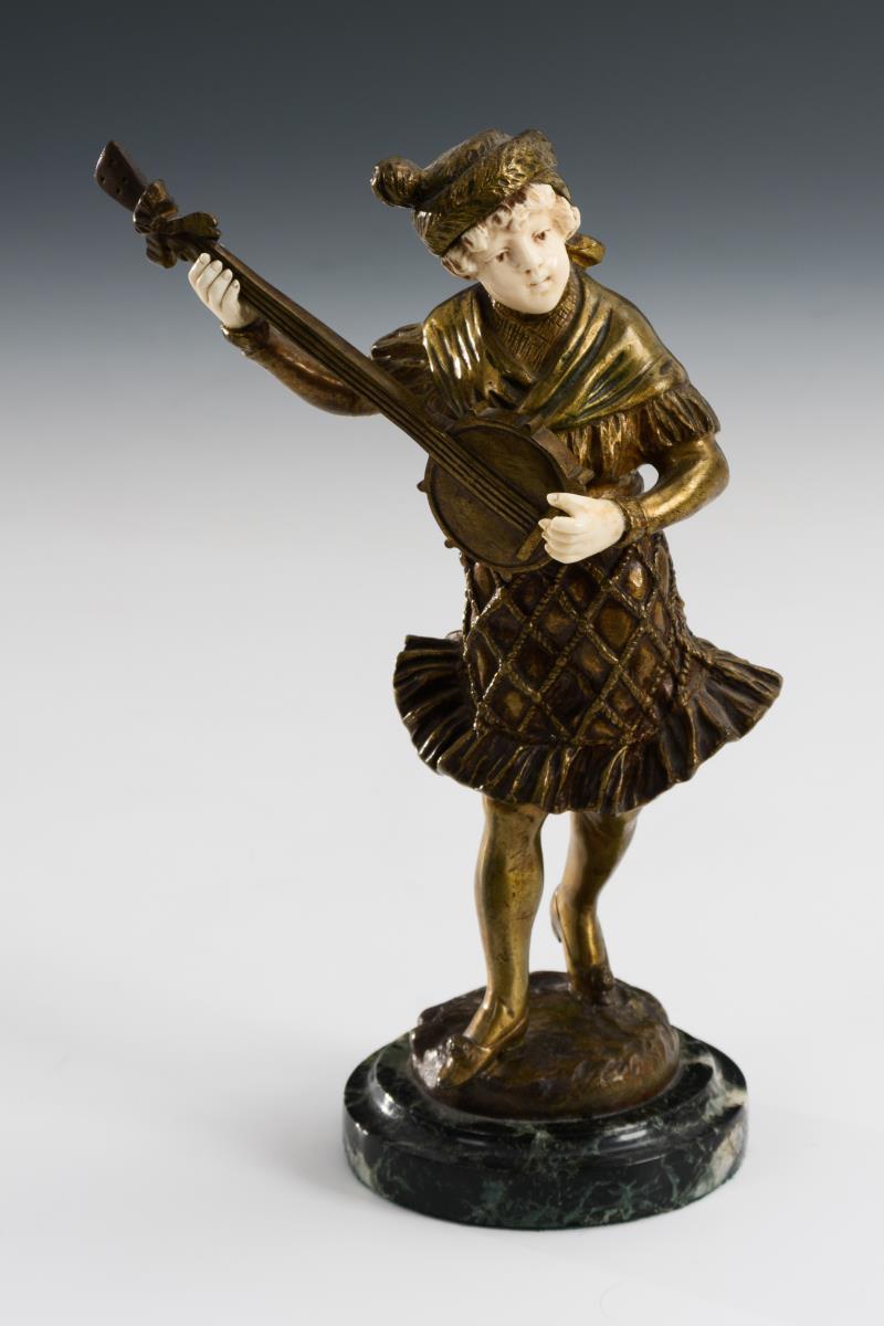 Bronze 2-farbig patiniert bzw. gefasst, Elfenbein, dunkelgrüne Marmor-Plinthe. Um 1920/30. Bezeichnet. H 20 / 22 cm.