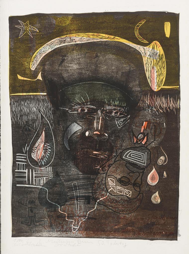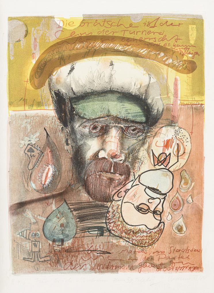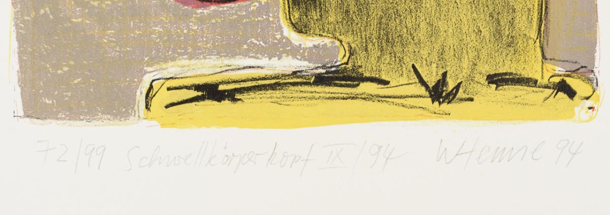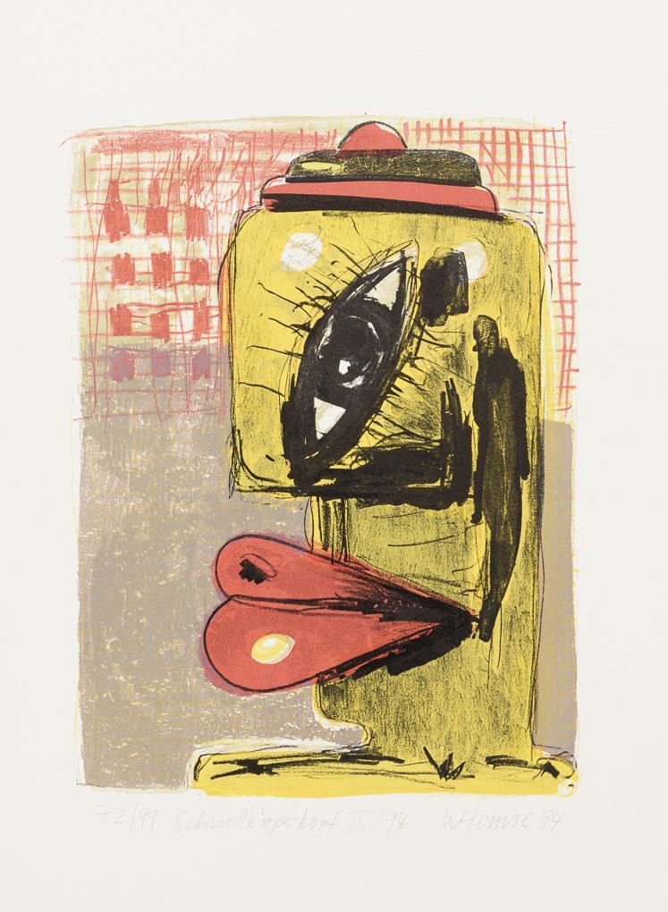 "Schwellkörperkopf IX/94", Blatt: 53,5 x 39 cm, Exemplar: 72/99, [19]94 | "Für Erich Mühsam zum 50. Todestag", Platte: 47 x 35 cm, Blatt: 53,5 x 39 cm, Exemplar: B 4/6, datiert: XI/84 | "E. Mühsam zum 50. Todestag", Platte: 48,5 x 34,5 cm, Blatt: 53,5 x 39,5 cm, Exemplar: 1 von 2 Unikatdrucken, datiert: I/85.