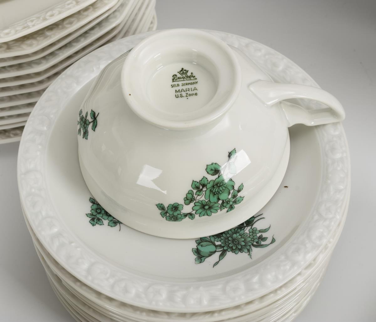 38 Teile. Kaffeekanne (H 25 cm), Milchkännchen, Zuckerdose, 10 Tassen, 12 Untertassen, 12 Frühstücksteller und 1 Kuchenteller. Bestoßung an 2 Untertassenrändern, 1 Untertasse und 1 Tasse mit Haarriss.