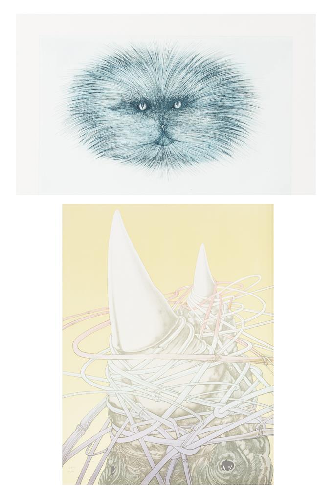 Undeutlich signiert: Nashornkopf in Seilen, Farblithografie, Bleistiftsignatur, Prägestempel "Editions Galerie Lahumière", Blatt: 68 x 52,5 cm, Exemplar: 82/150 | Schwarz, Reiner?: Kopf eines Stachelschweins, Radierung in Blau, Bleistiftsignatur, Platte: 32,5 x 49 cm, Blatt: 50,5 x 66,5 cm, Exemplar: 31/75 .