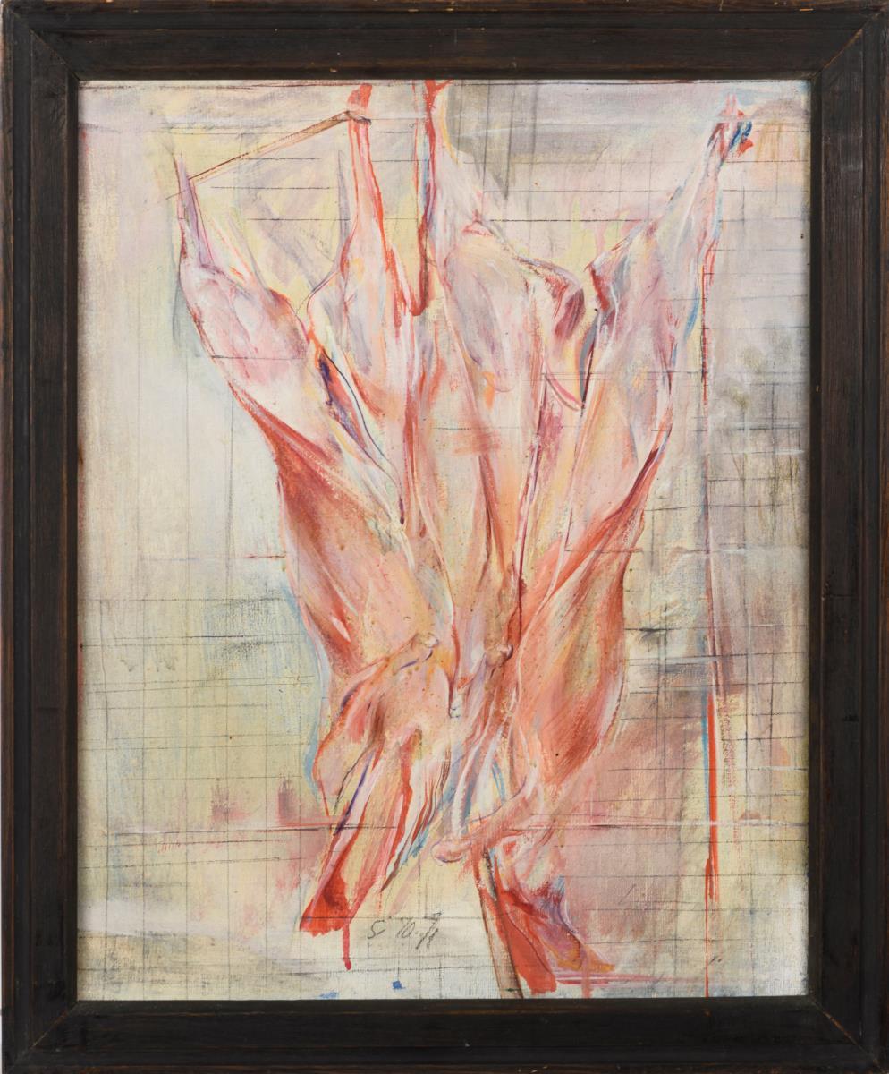 Verfremdete Darstellung von zwei Schweinehälften.