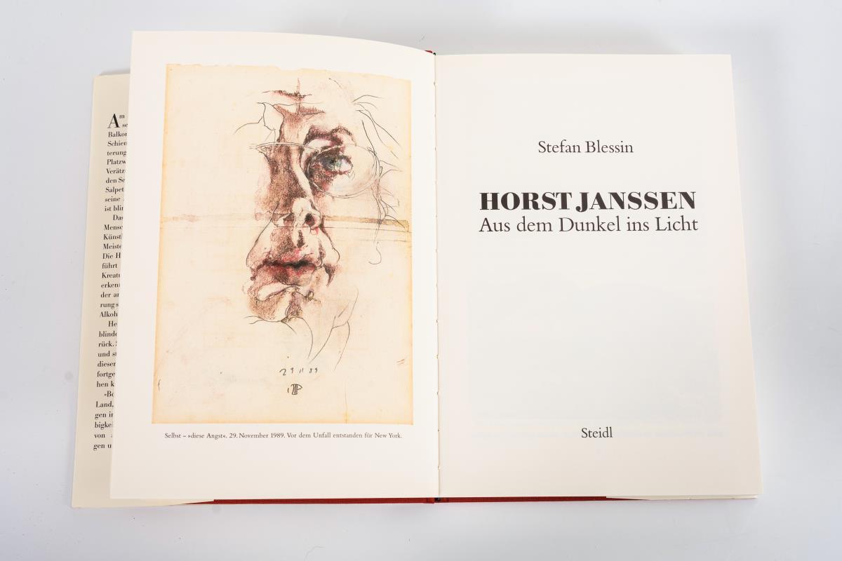 Stefan Blessin: "Horst Janssen - Aus dem Dunkel ins Licht", Steidl Verlag, Göttingen 1992, 253 Seiten. / "Querbeet - Aufsätze, Reden, Traktate, ....", signiert, Christians Verlag, Hamburg 1981, 436 Seiten; gleicher Titel nochmal in Broschur. / "Horst Janssen" Verlag St Gertrud 1991, in englischer und japanischer Sprache, 414 Seiten. / "Ach, Liebste flieg mir nicht weg - Briefe an Gesche", Rowohlt Verlag 2004, 251 Seiten. / "Die Kopie" dtv Verlag 1981, 239 Seiten . Kaum Gebrauchsspuren.