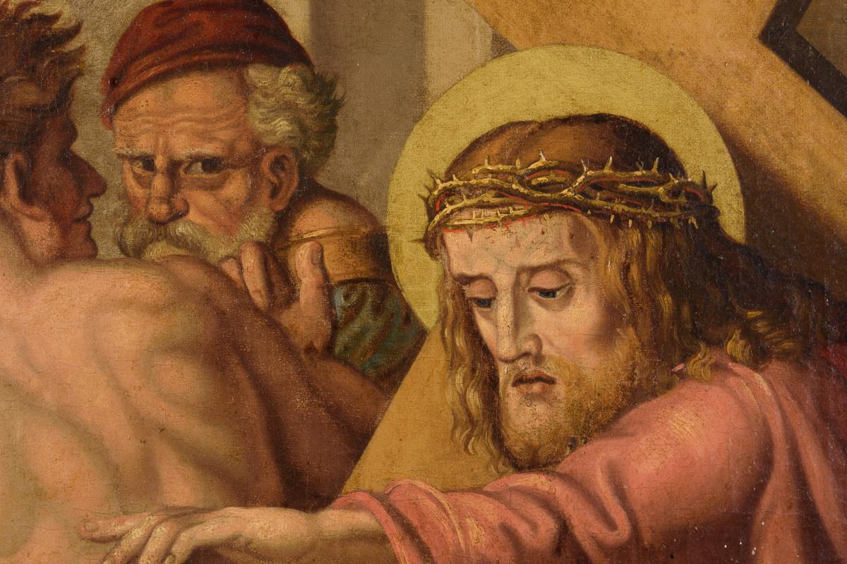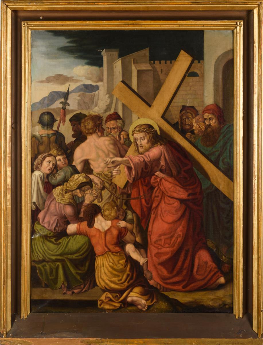 Jesus mit dem Kreuz in der Menschenmenge auf dem Weg zur Kreuzigungsstätte und beim Segnen der weinenden Gläubigen am Wegesrand. Ein Leinwanddefekt, eine restaurierte Stelle mit Hinterklebung.