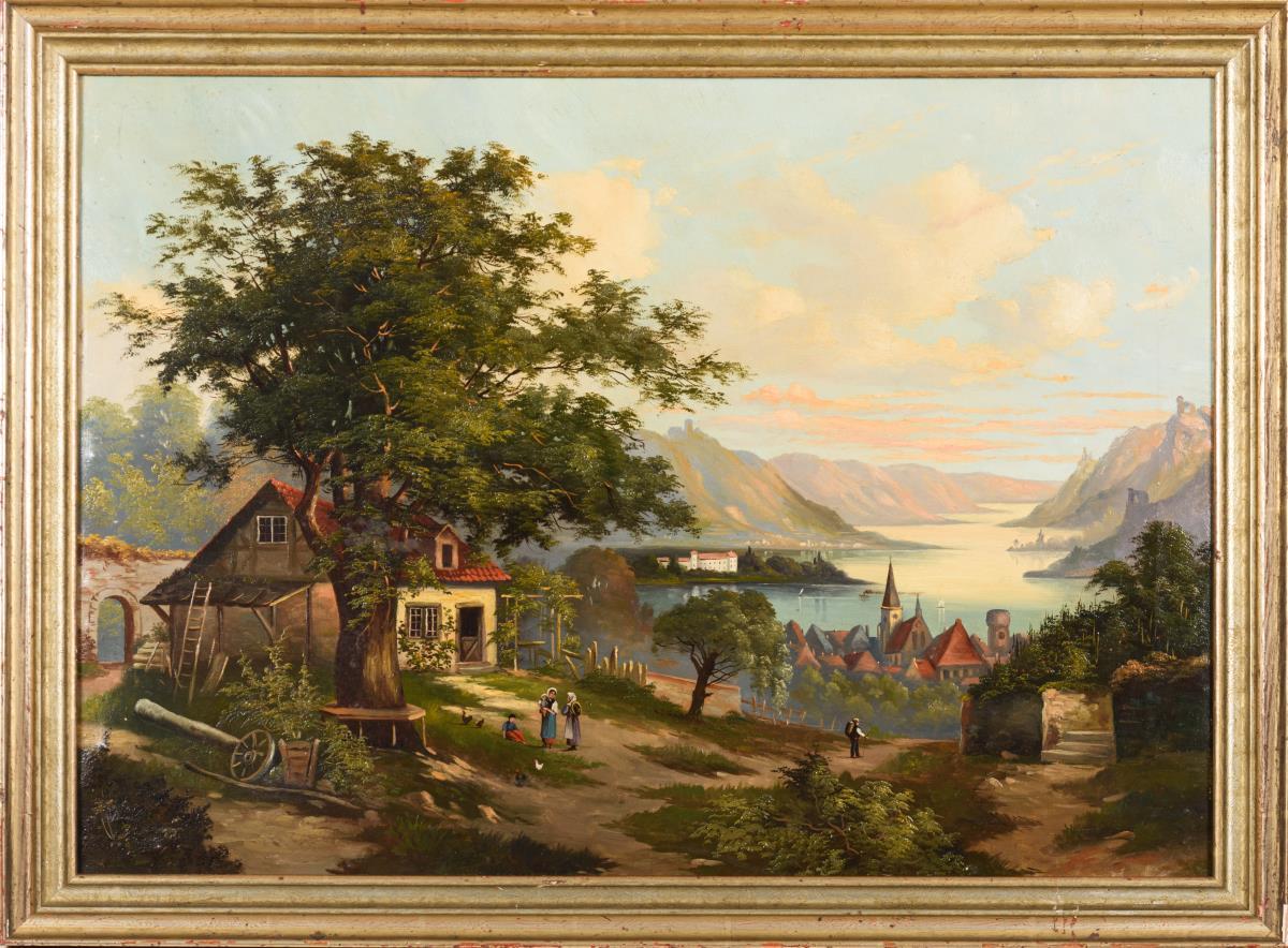 Weite Flusslandschaft mit Burgruinen auf den Berggipfeln und einer Ortschaft mit Staffage im Vordergrund.