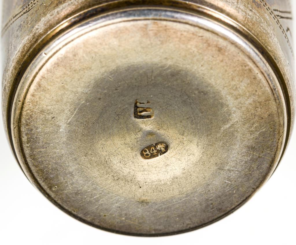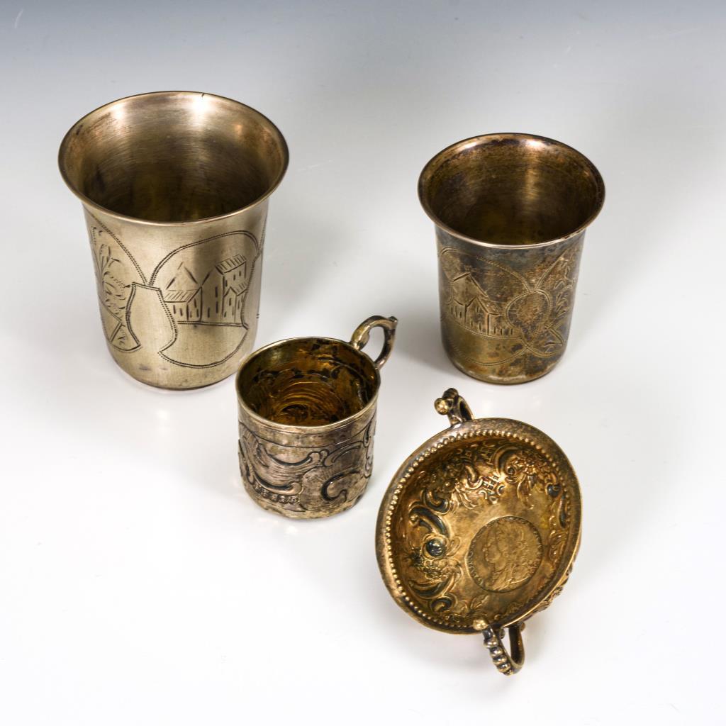 3 russische Becher und 1 Münzschälchen. Alters- und starke Gebrauchsspuren.
